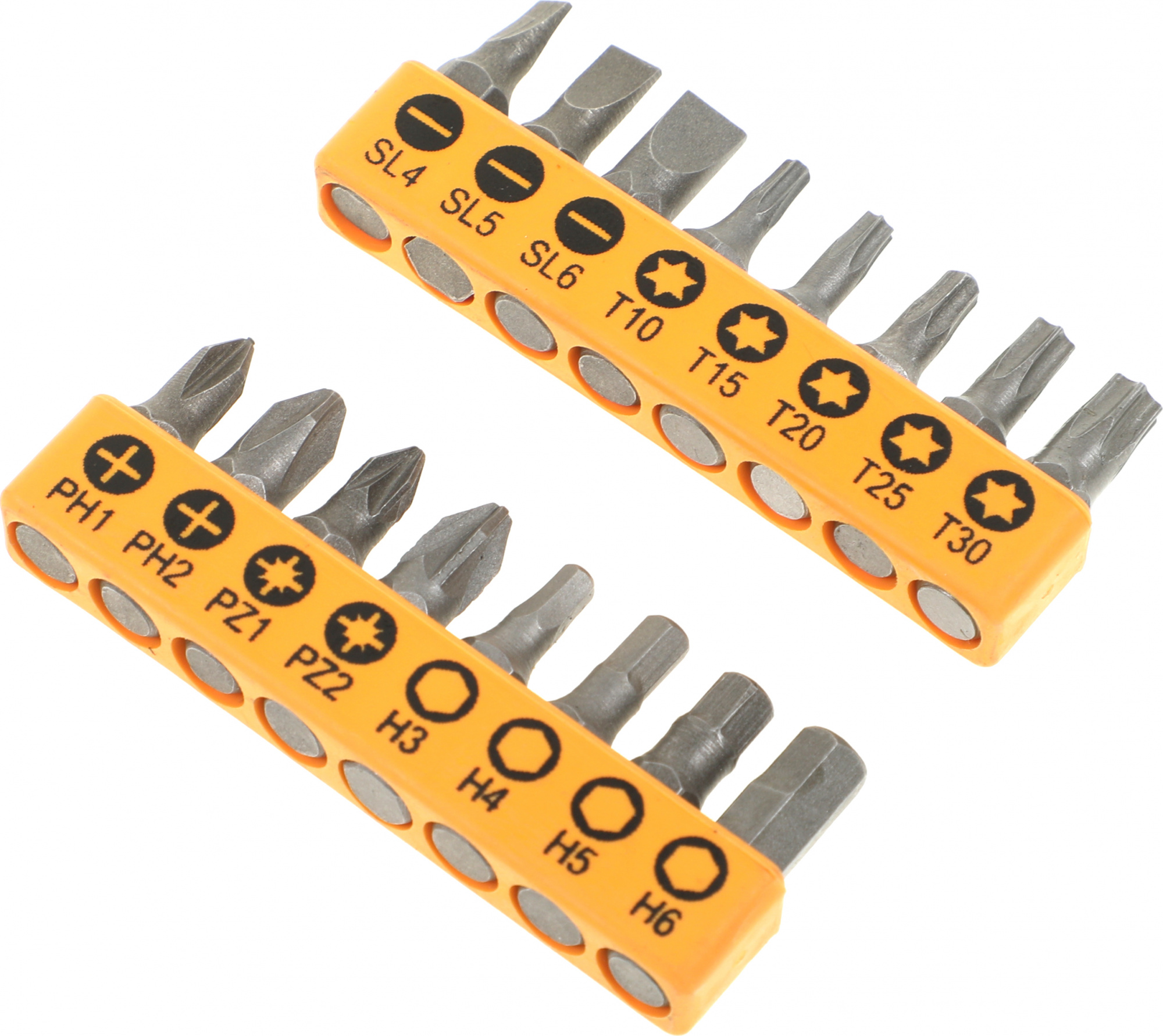 Головки с битами: SL4, 5.5, 7; PH1, 2; PZ1, 2; H3, 4, 5, 6; T8,10, 15, 20,25,27,30.