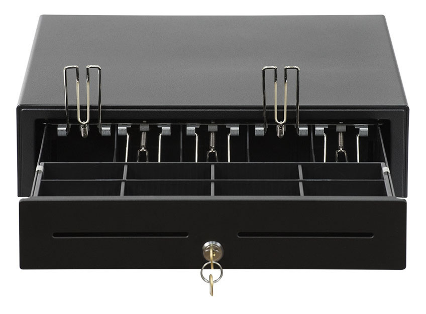 Корпус АТОЛ CD-410 выполнен из металла. В денежном ящике 5 отделений для купюр, 8 ячеек для монет и большое отделение для хранения чеков и счетов. Конструкция денежного ящика позволяет менять ширину отделений для купюр, а отделение для монет может выниматься из денежного ящика.