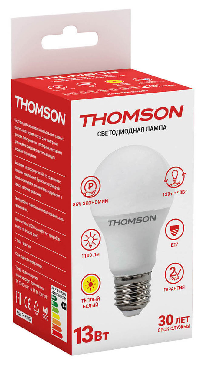 Светодиодная лампочка в форме груши с цоколем E27 и размерами 110 мм по высоте и диаметром в 60 мм обладает мощностью в 13 W, благодаря чему она может осветить 5 кв. м. Цветовая температура – 3000 К, т.е. теплый свет близкий к цвету Солнца