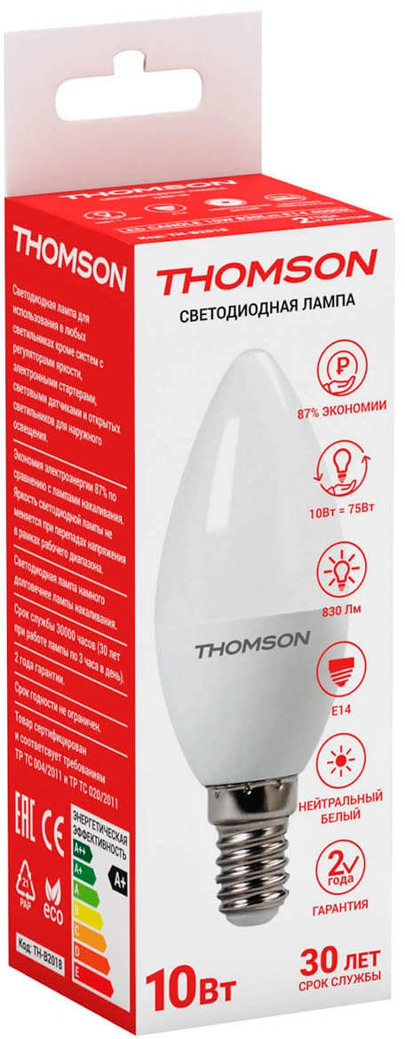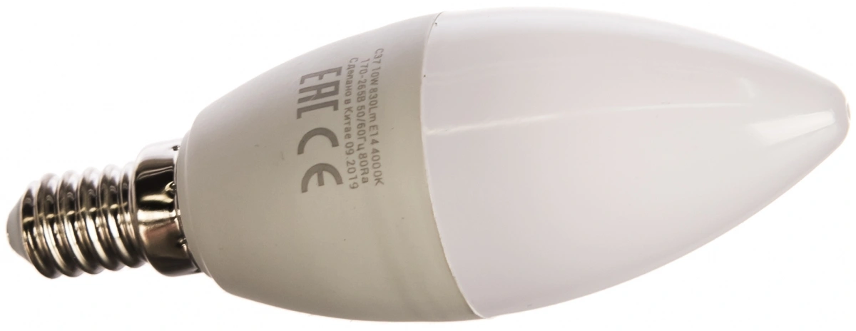 Светодиодная лампочка в форме свечи с цоколем E14 и размерами 100 мм по высоте и диаметром в 40 мм обладает мощностью в 10 W, благодаря чему она может осветить 4 кв. м. Цветовая температура – 4000 К, т.е. белый свет, подходящий для рабочего настроя