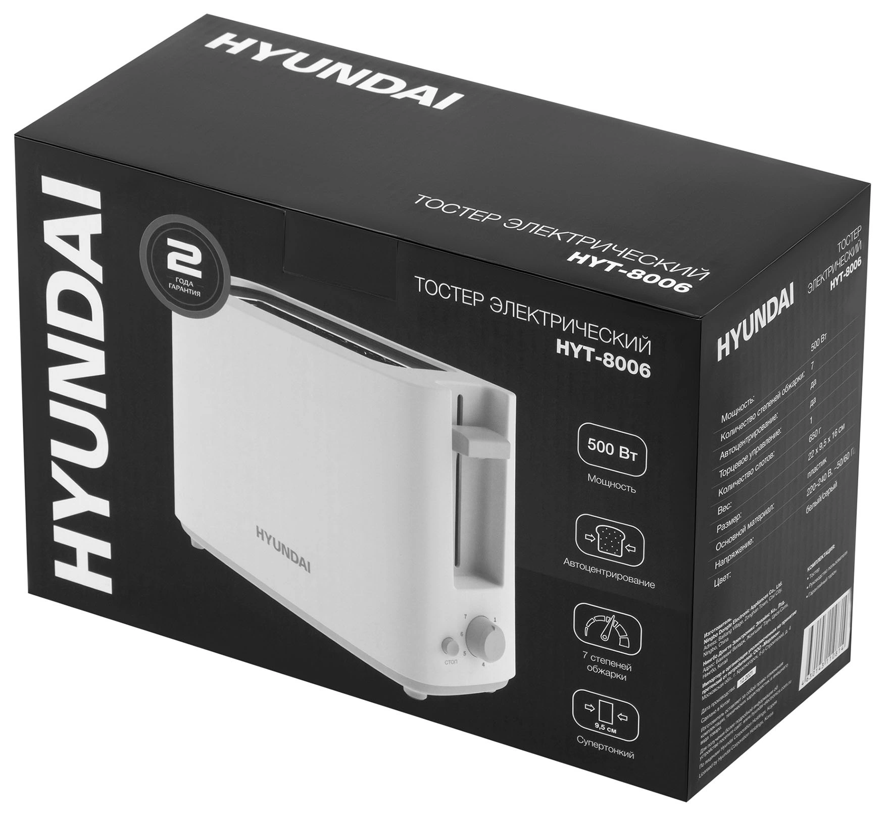 Любители тостов точно будут в восторге от модели HYUNDAI HYT-8006 с мощностью 500 Вт. С простым механическим управлением справится даже ребёнок, а 7 степеней обжарки будут каждый день радовать вас разнообразными тостами. Для более комфортного использования предусмотрен отсёк для сбора крошек, а сетевой шнур больше не будет мешаться за счёт специального отсека для хранения. Функция автоцентрирования обеспечивает равномерную прожарку хлеба со всех сторон. Есть автоматическое поднятие тостов, а также индикатор остаточного времени. Прорезиненная основа обеспечит устойчивость тостера на любой поверхности. Корпус изготовлен из высококачественного пластика, устойчивого к повреждениям.