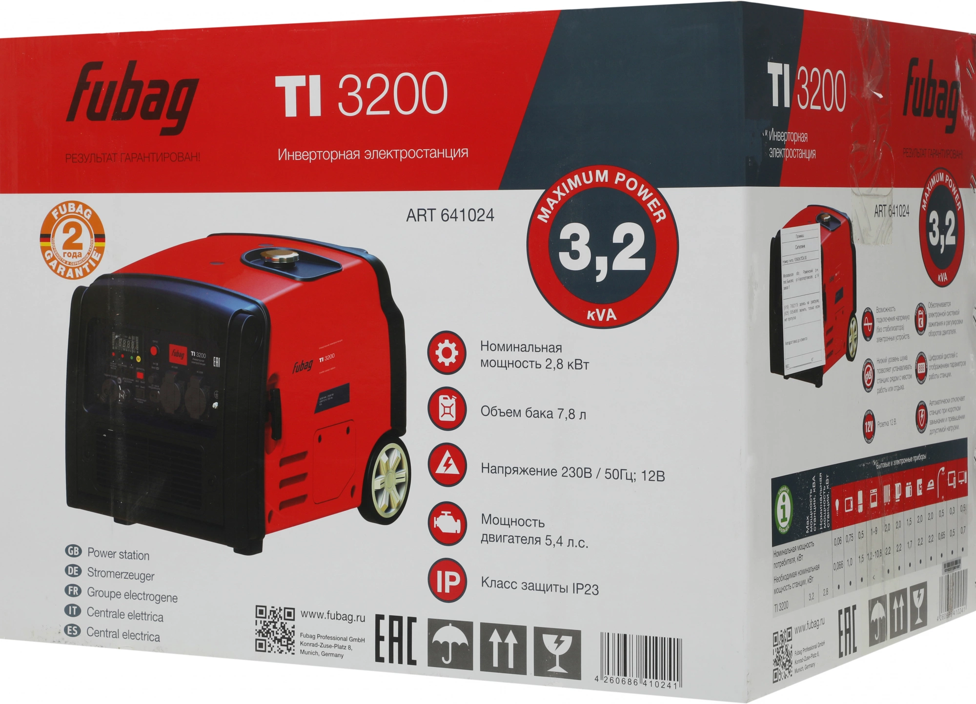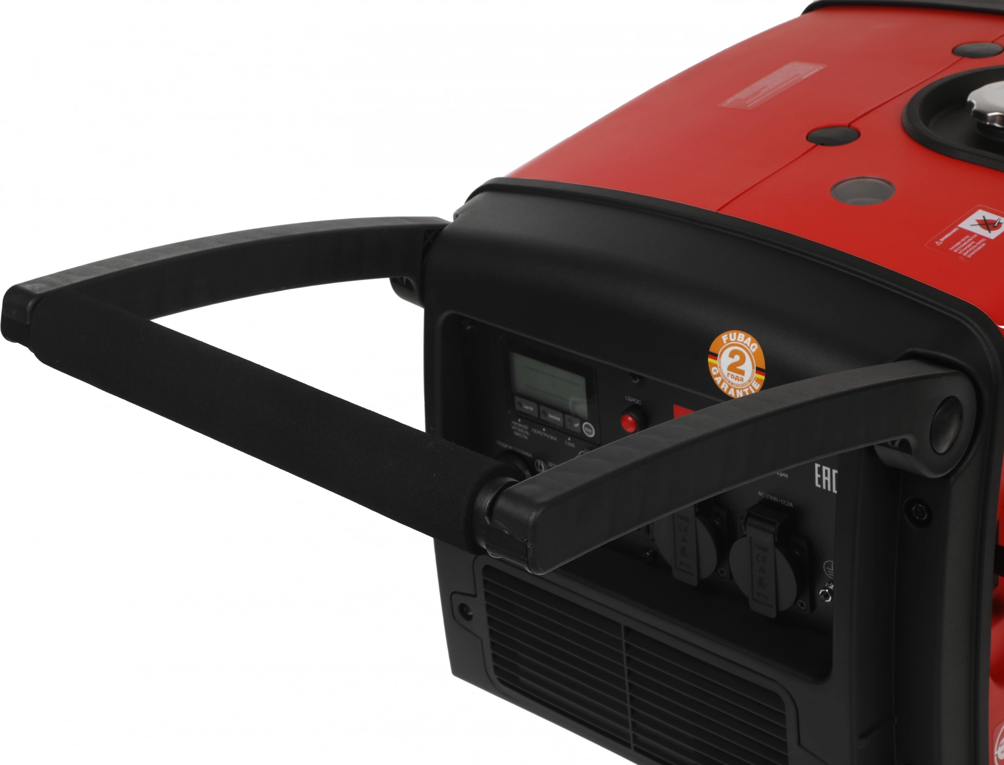 Профессиональный OHV-двигатель FUBAG. Вместительный бак 7,8 л для работы до 4,5 часов без дозаправки (75% нагрузки). 1 розетка 12 В и 2 розетки 230В/16А. Режим экономии топлива. Шумозащитный кожух. Мультифункциональный цифровой дисплей.