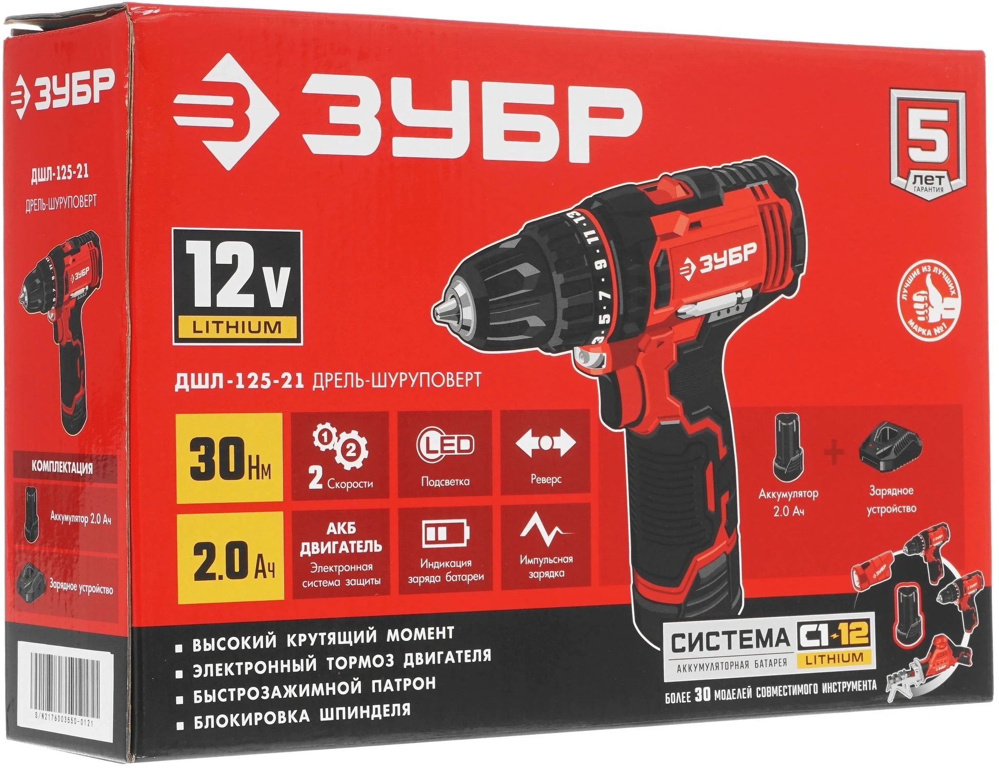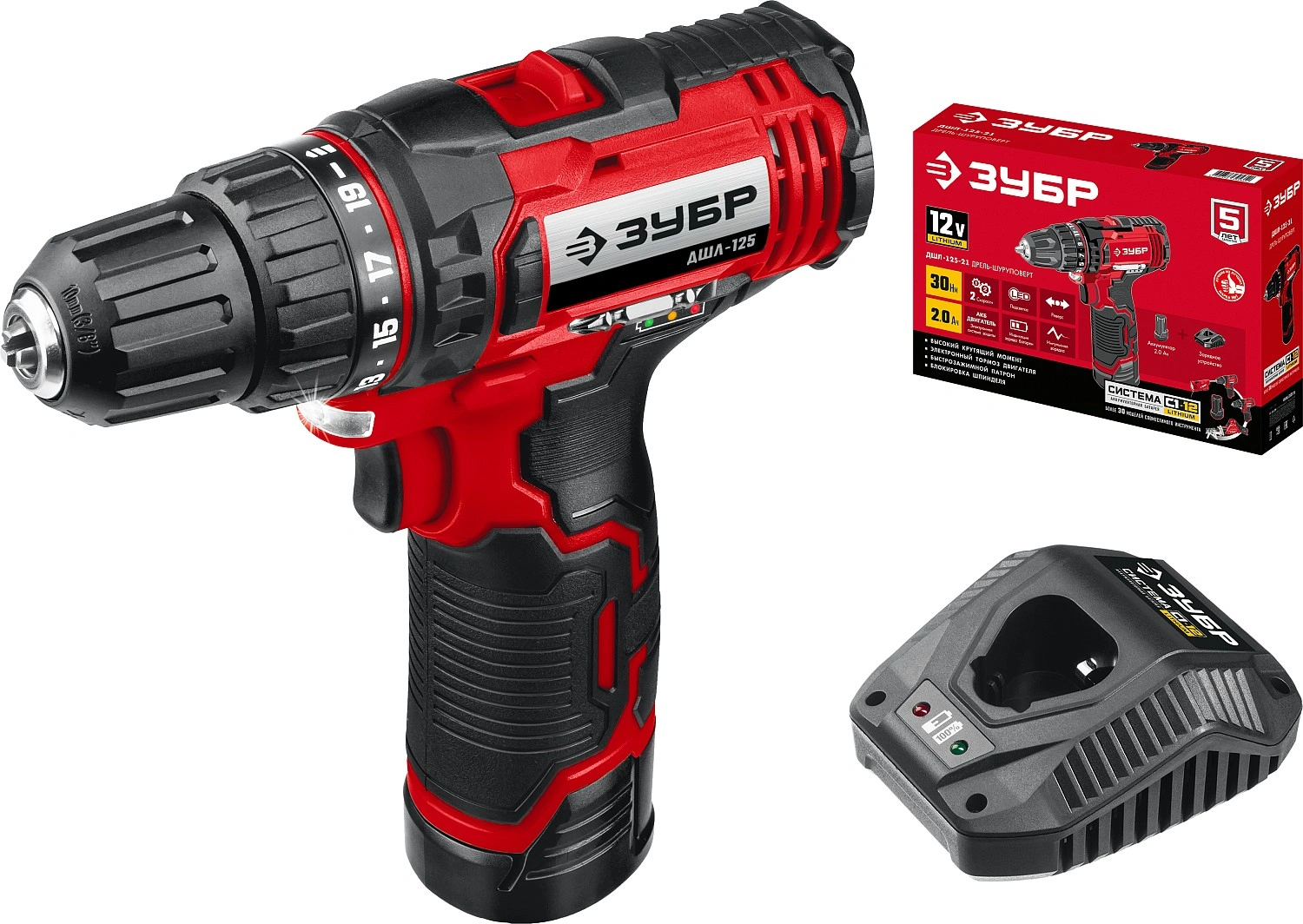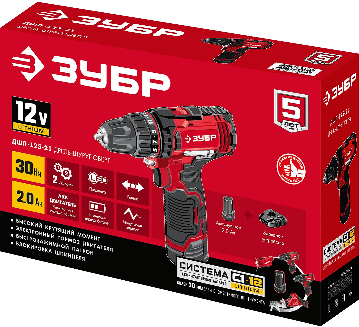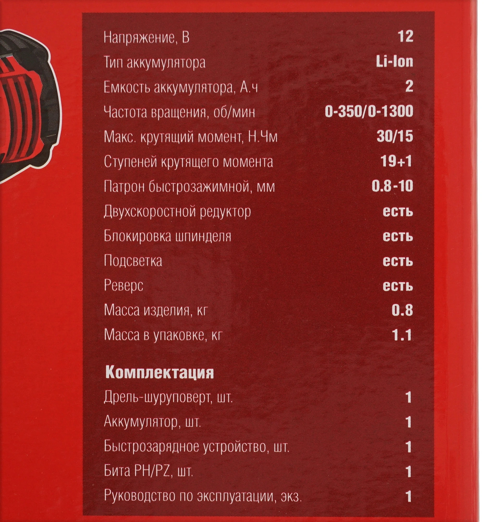Дрель-шуруповерт, аккумулятор, быстрозарядное устройство, бита 50 мм. (PH, PZ) - 1 шт., руководство по эксплуатации.