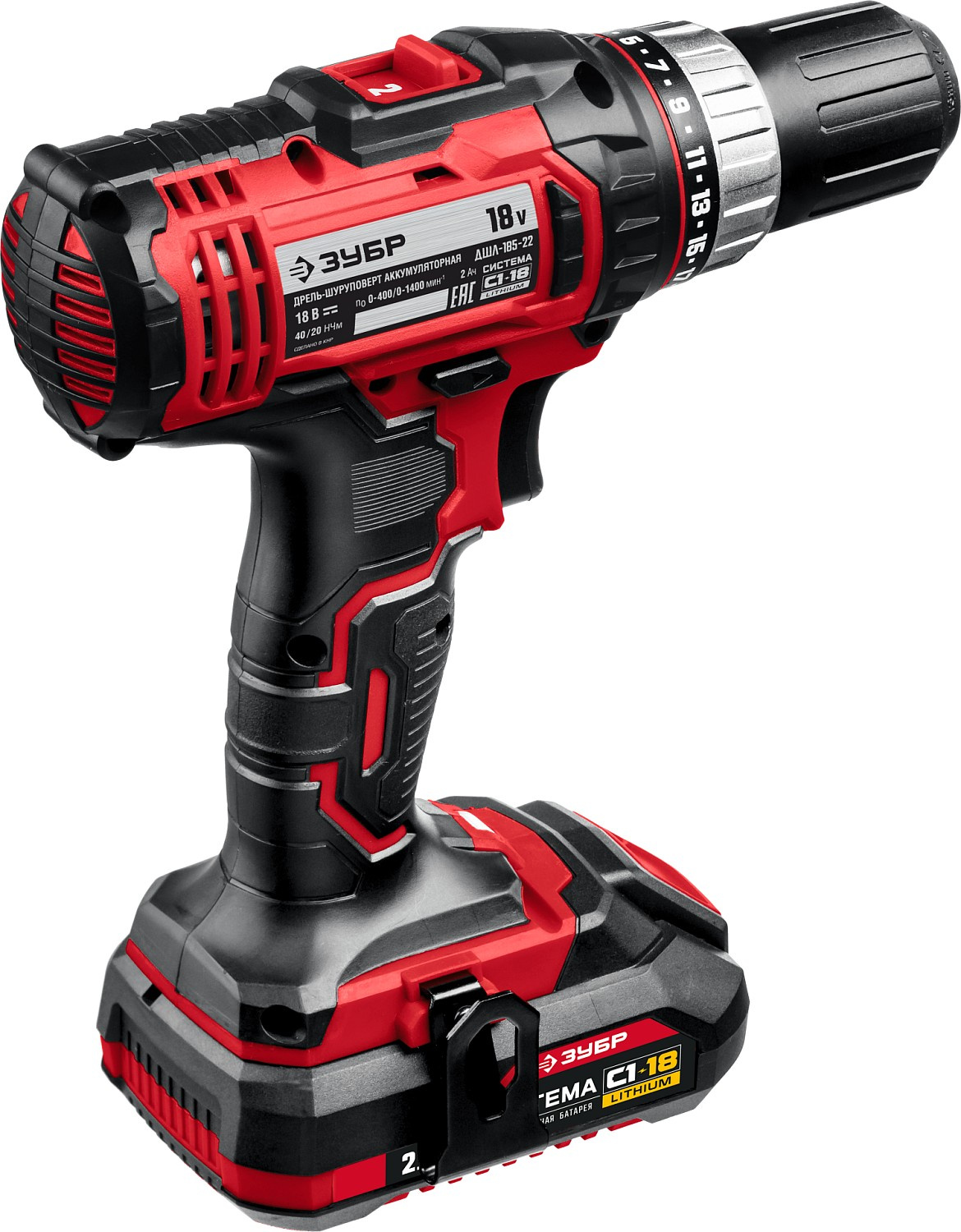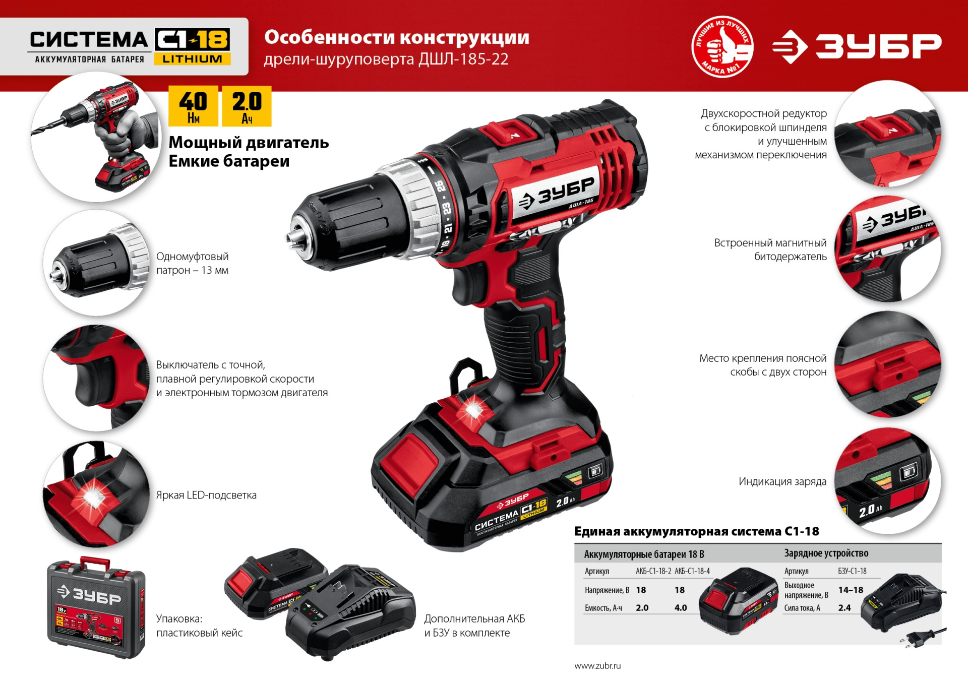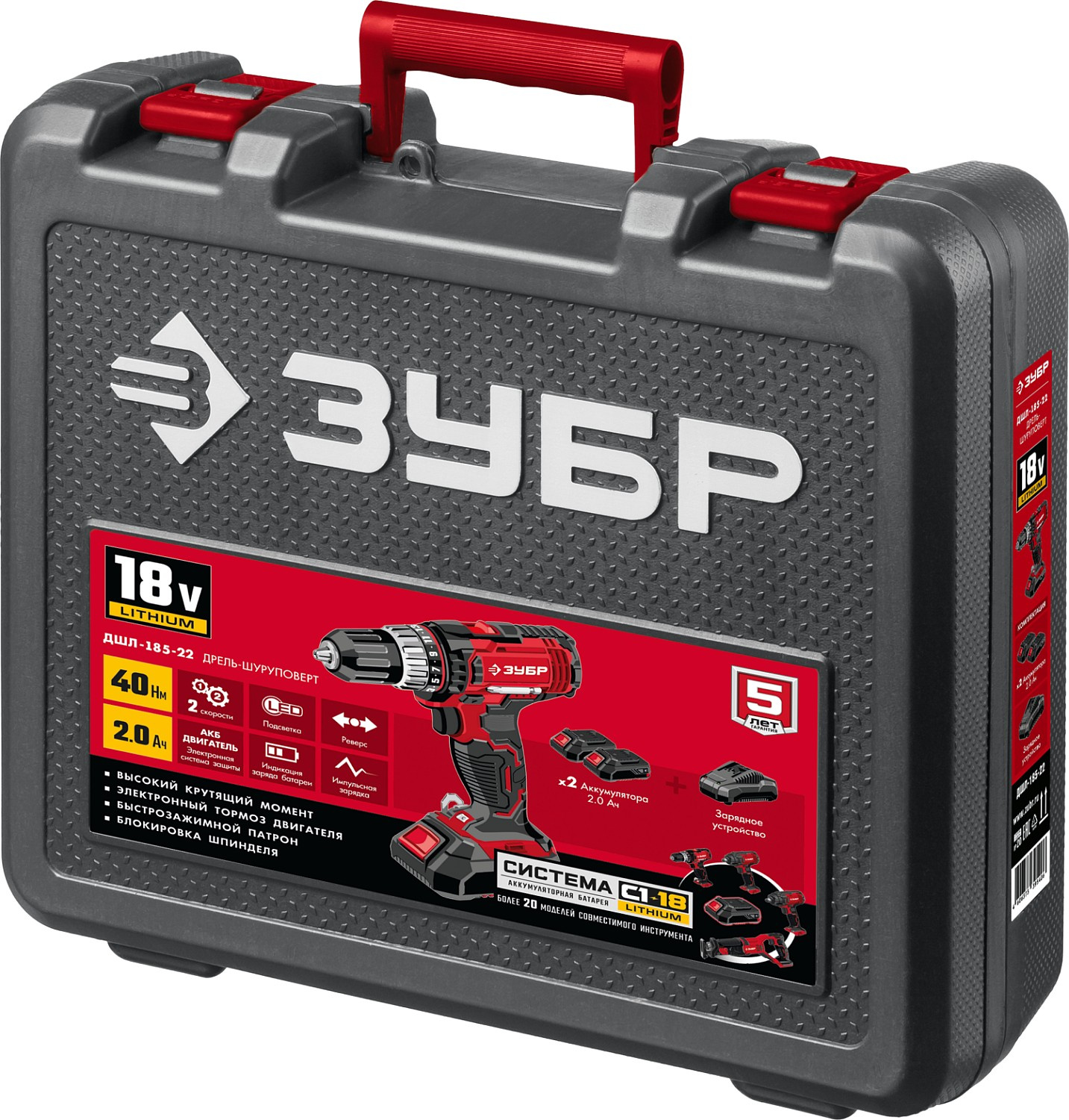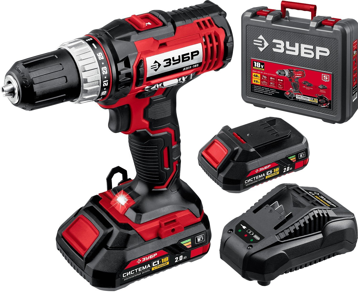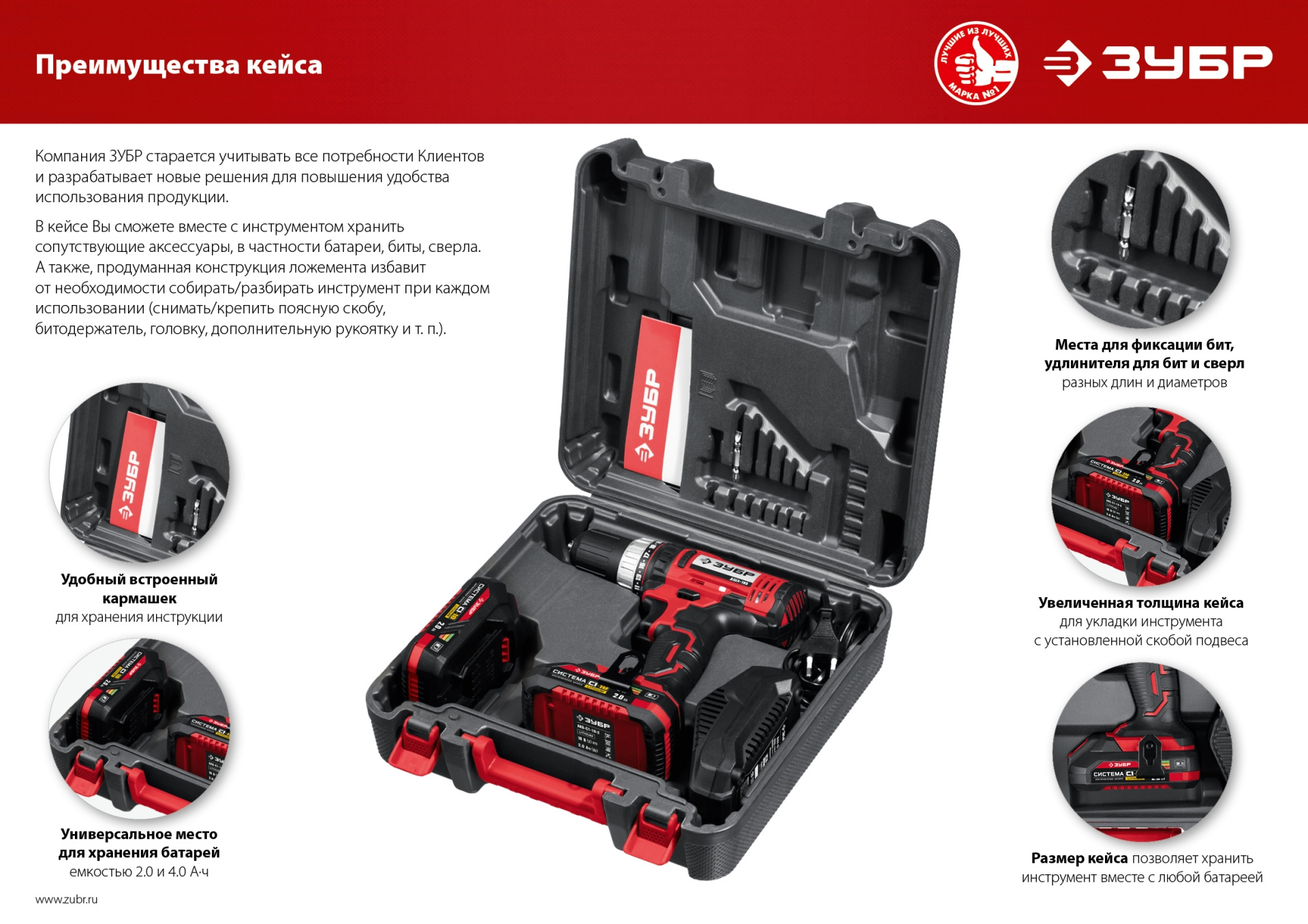 Дрель-шуруповерт, аккумулятор - 2 шт., быстрозарядное устройство, бита 50 мм. (PH, PZ) - 1 шт., скоба поясная, кейс, руководство по эксплуатации.