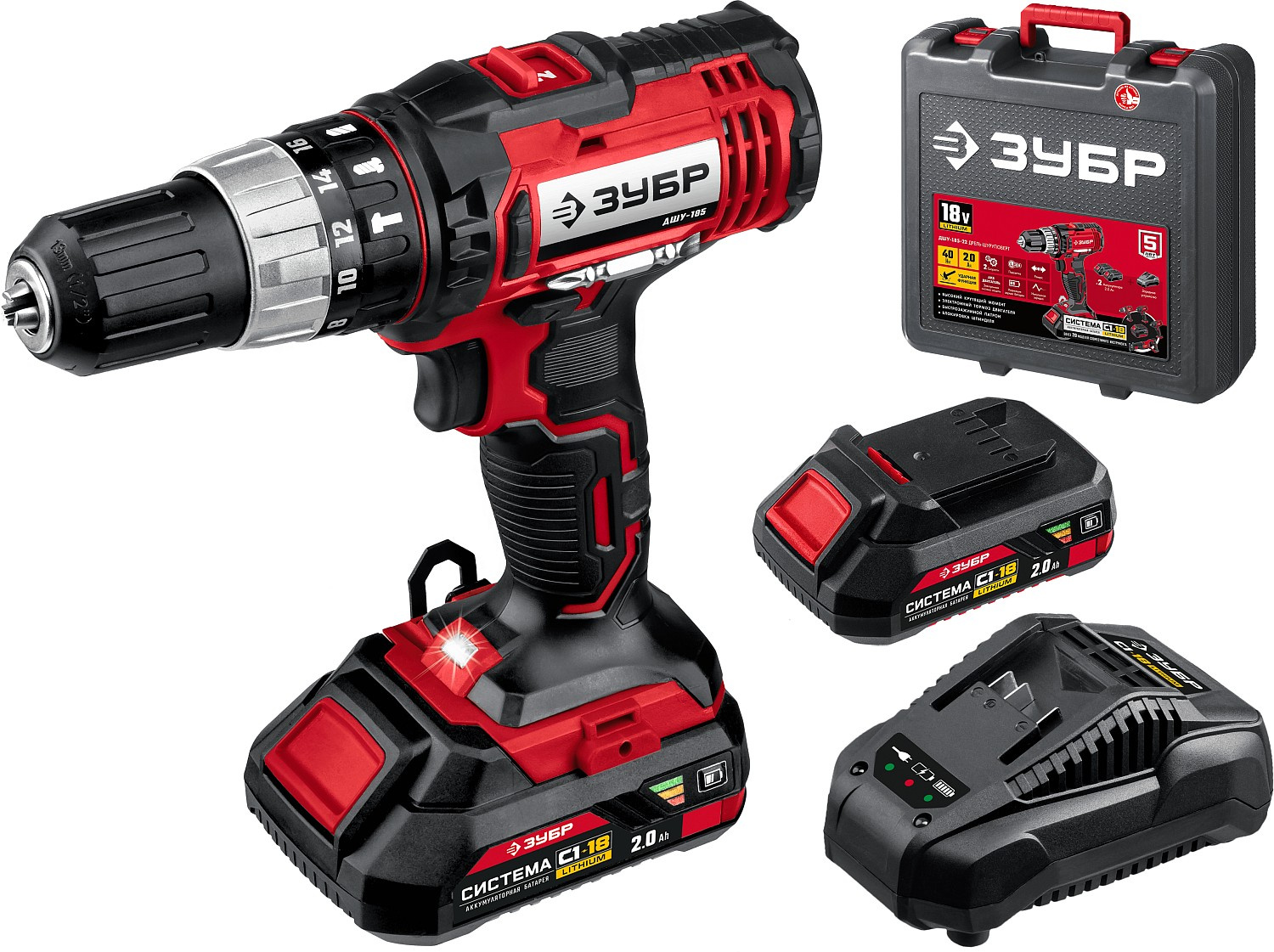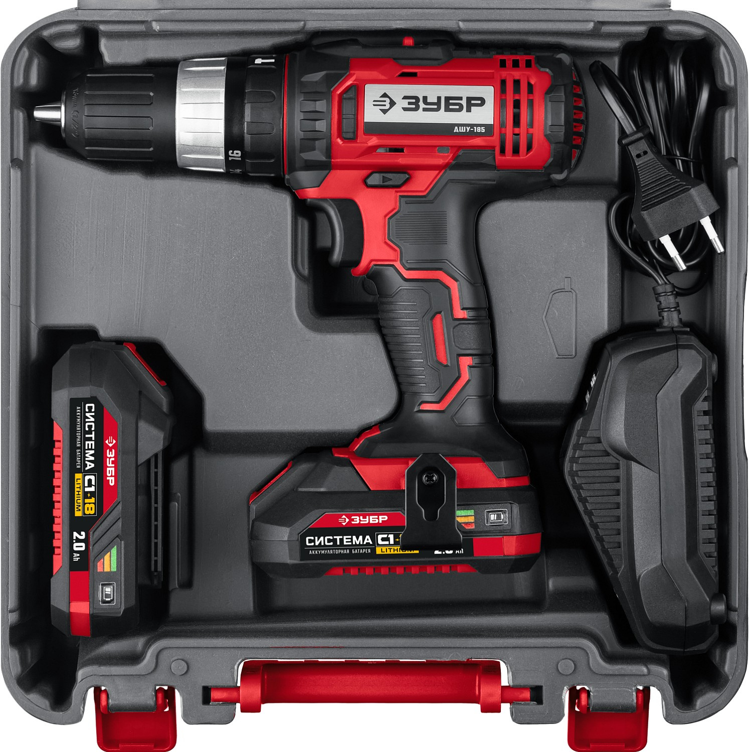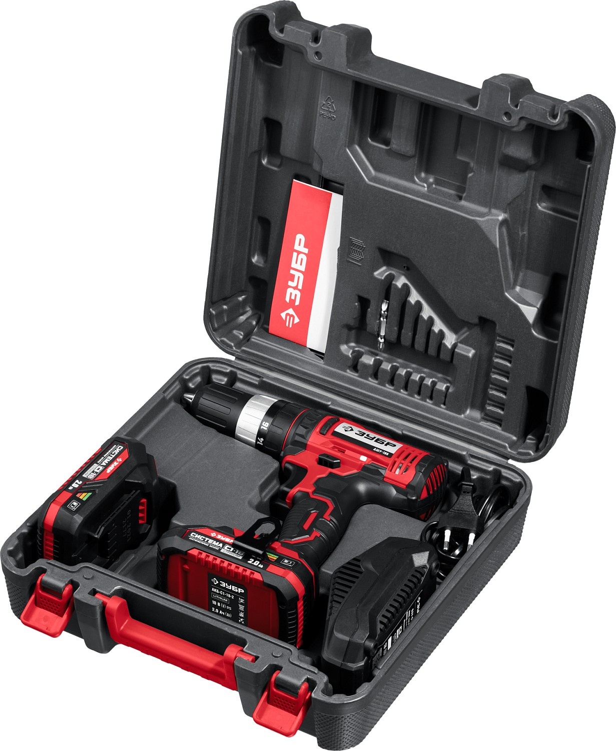 Ударная дрель-шуруповерт, аккумулятор - 2 шт., быстрозарядное устройство, бита 50 мм. (PH, PZ - 1 шт.), скоба поясная, кейс, руководство по эксплуатации.