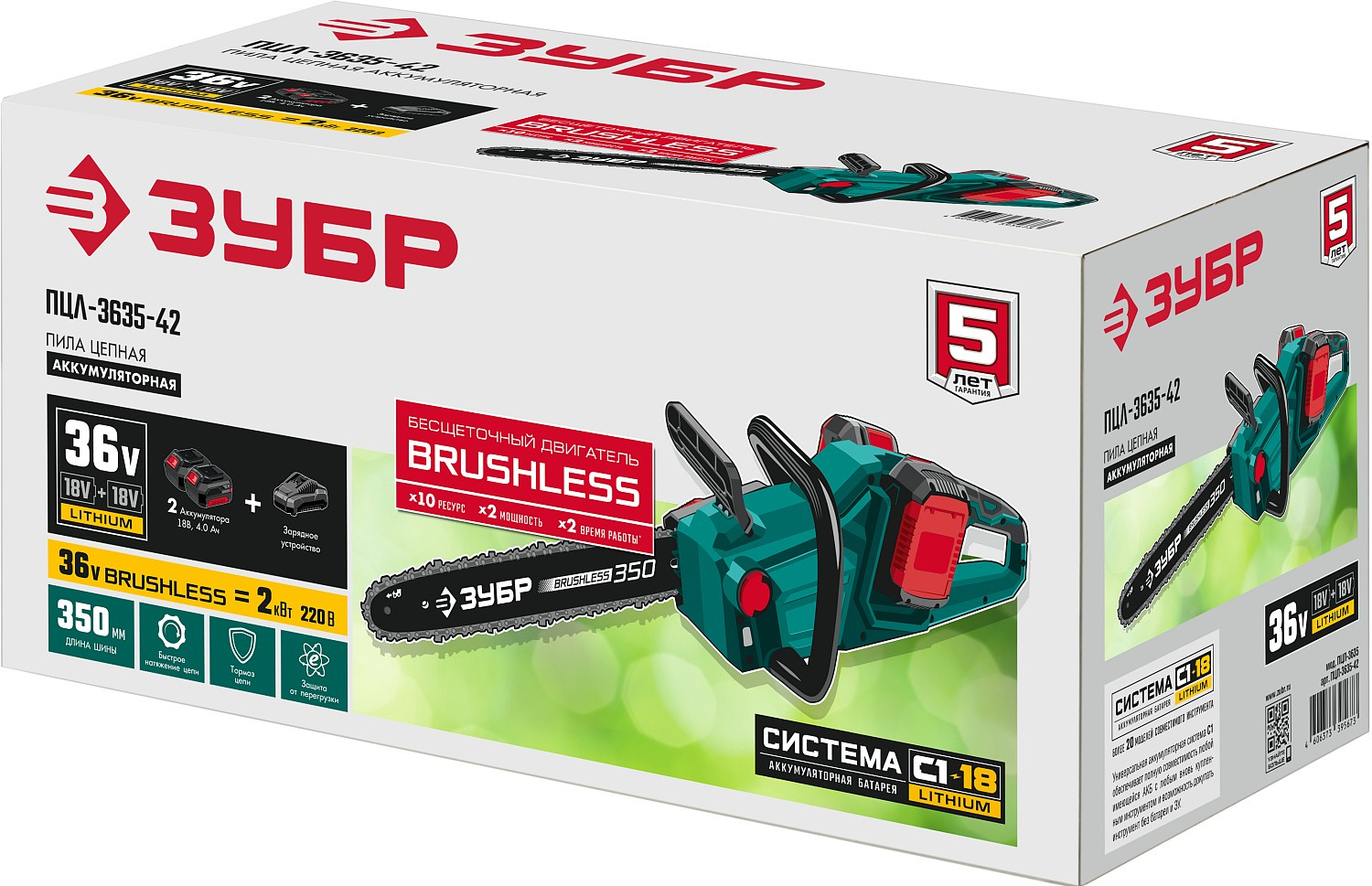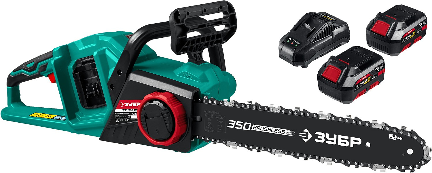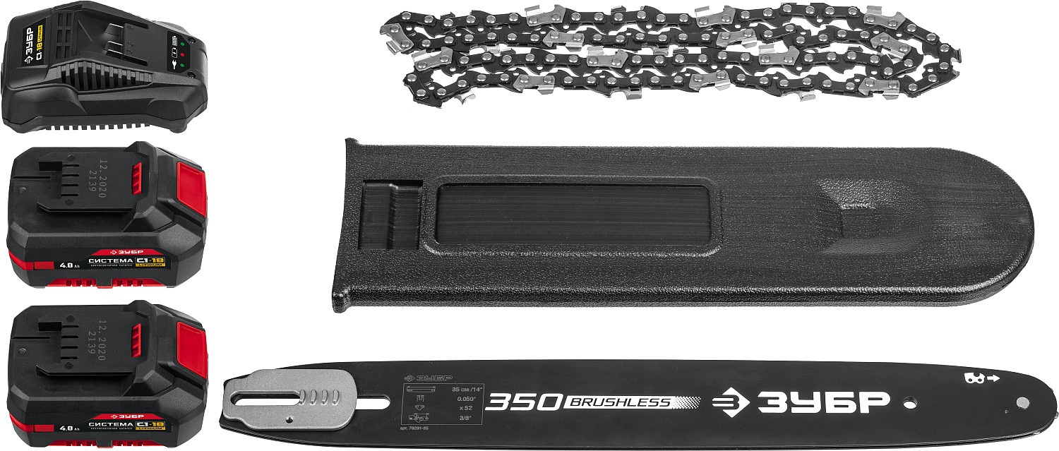 Пила, аккумулятор - 2 шт., зарядное устройство, шина, цепь пильная, кожух шины, руководство по эксплуатации.