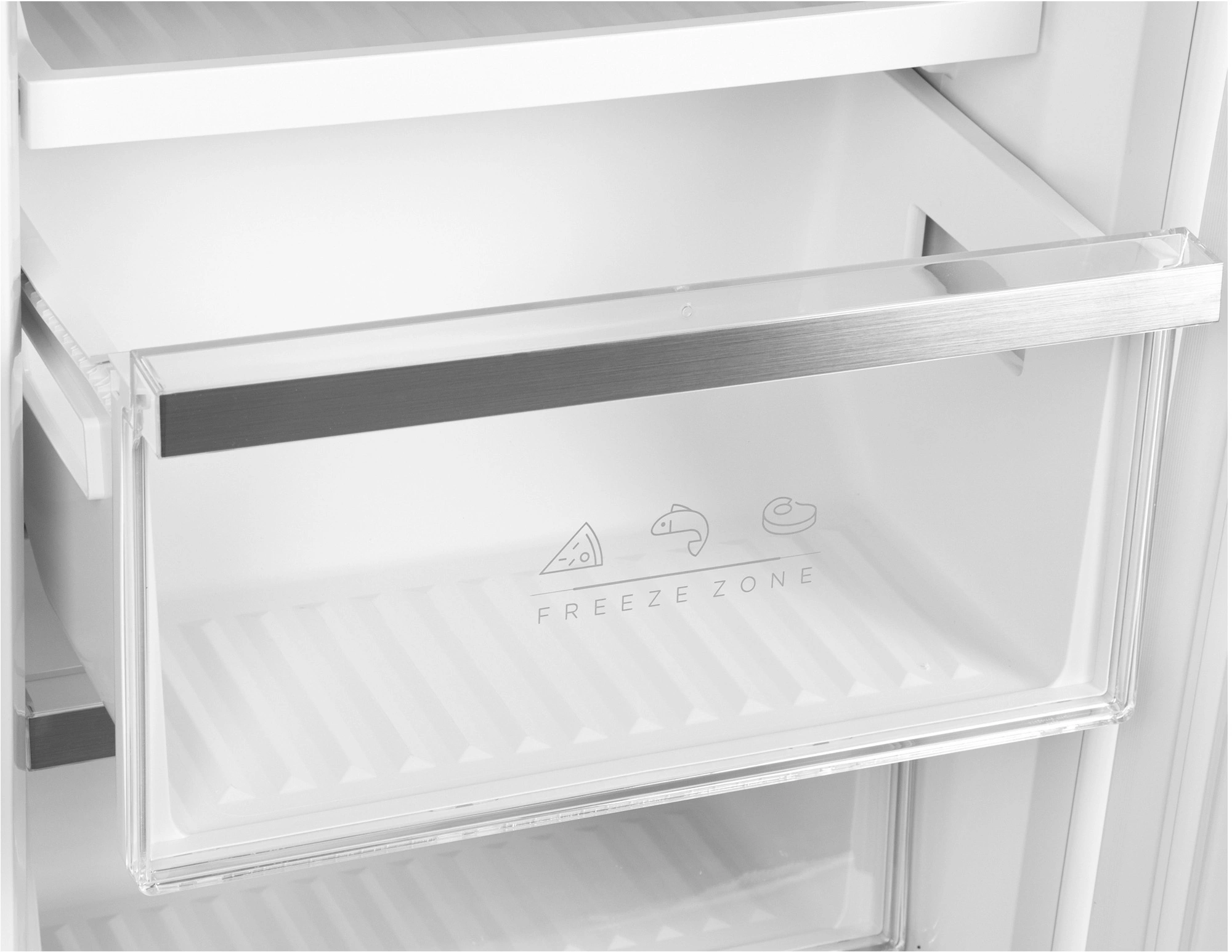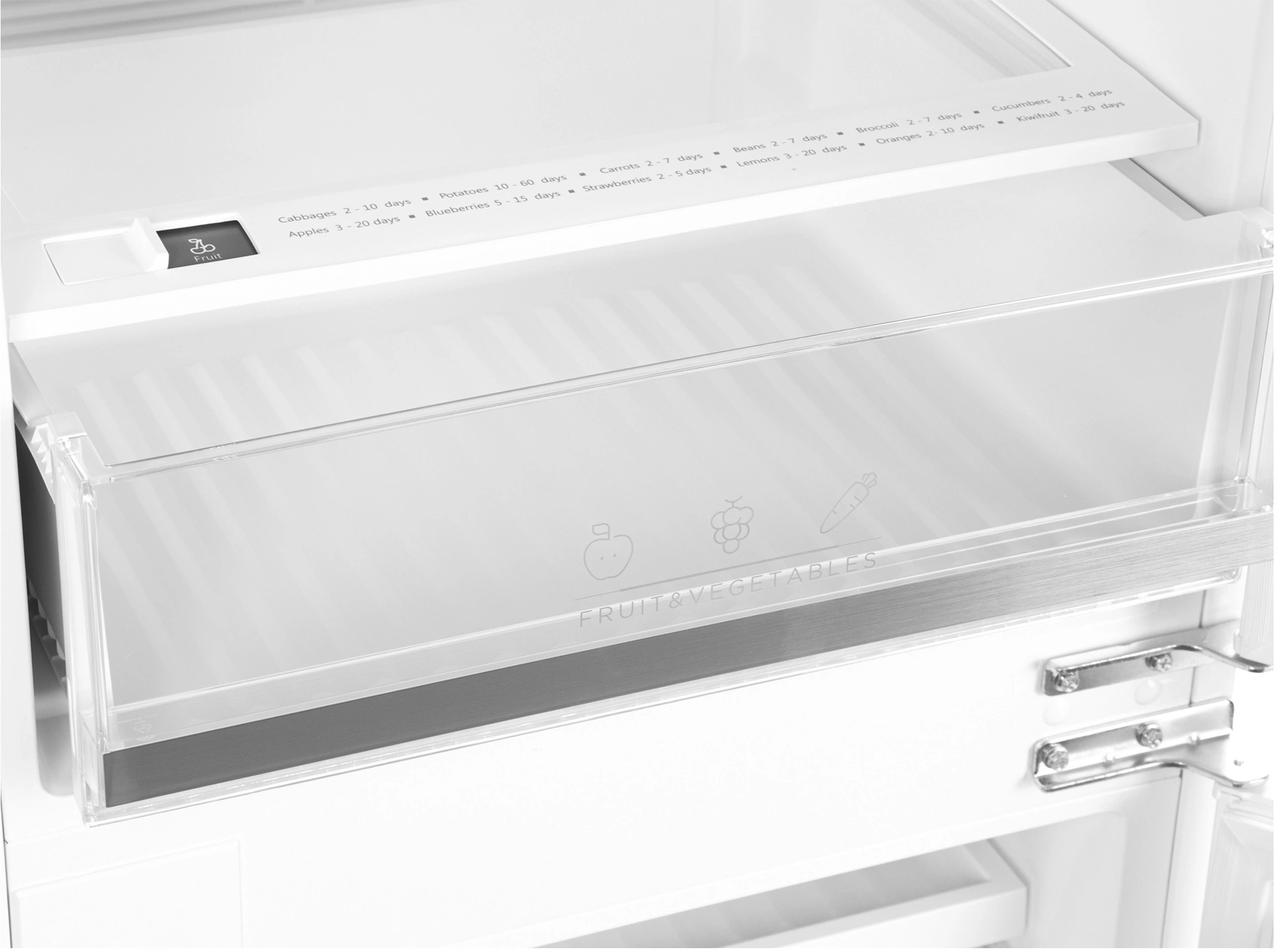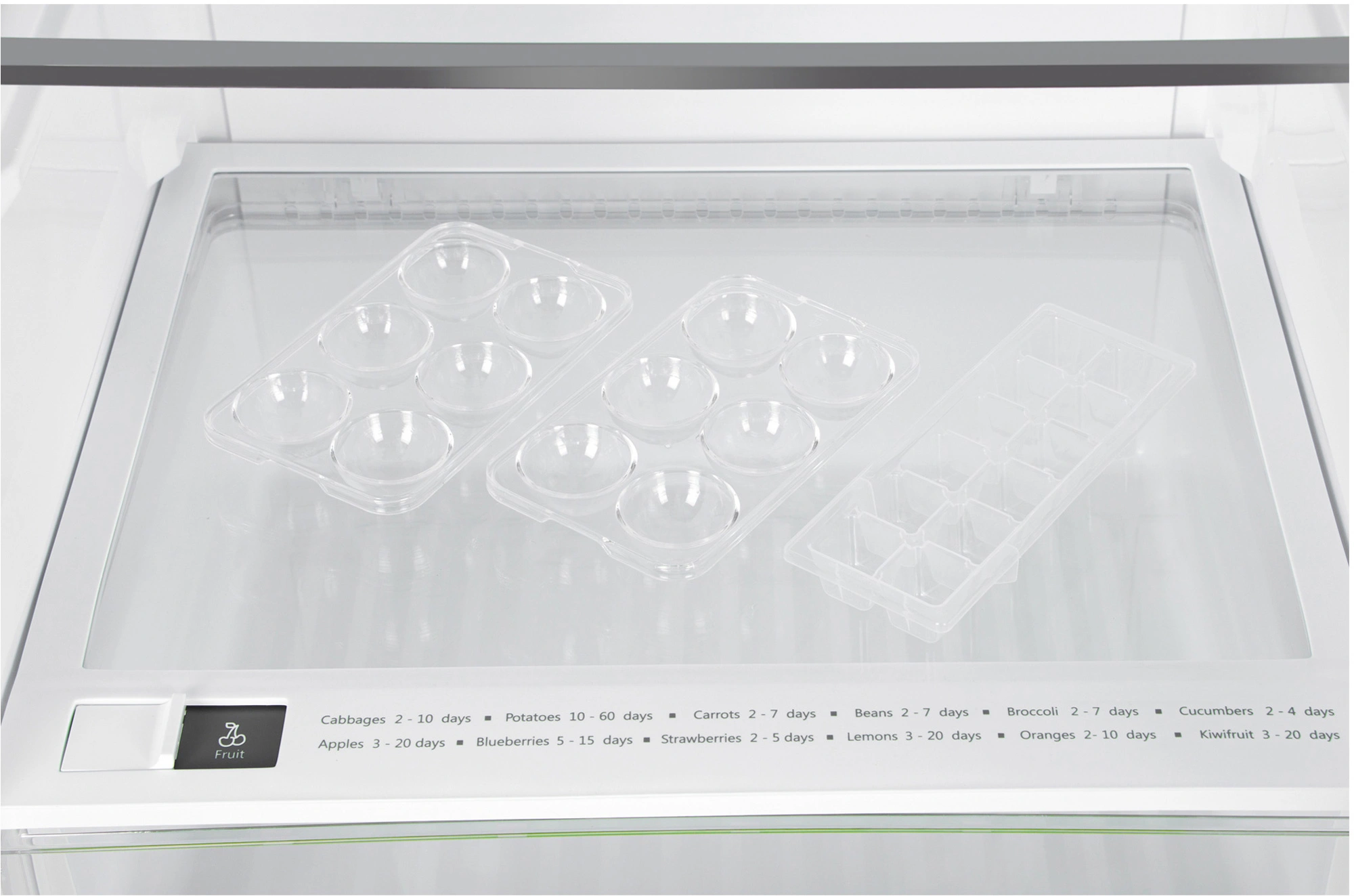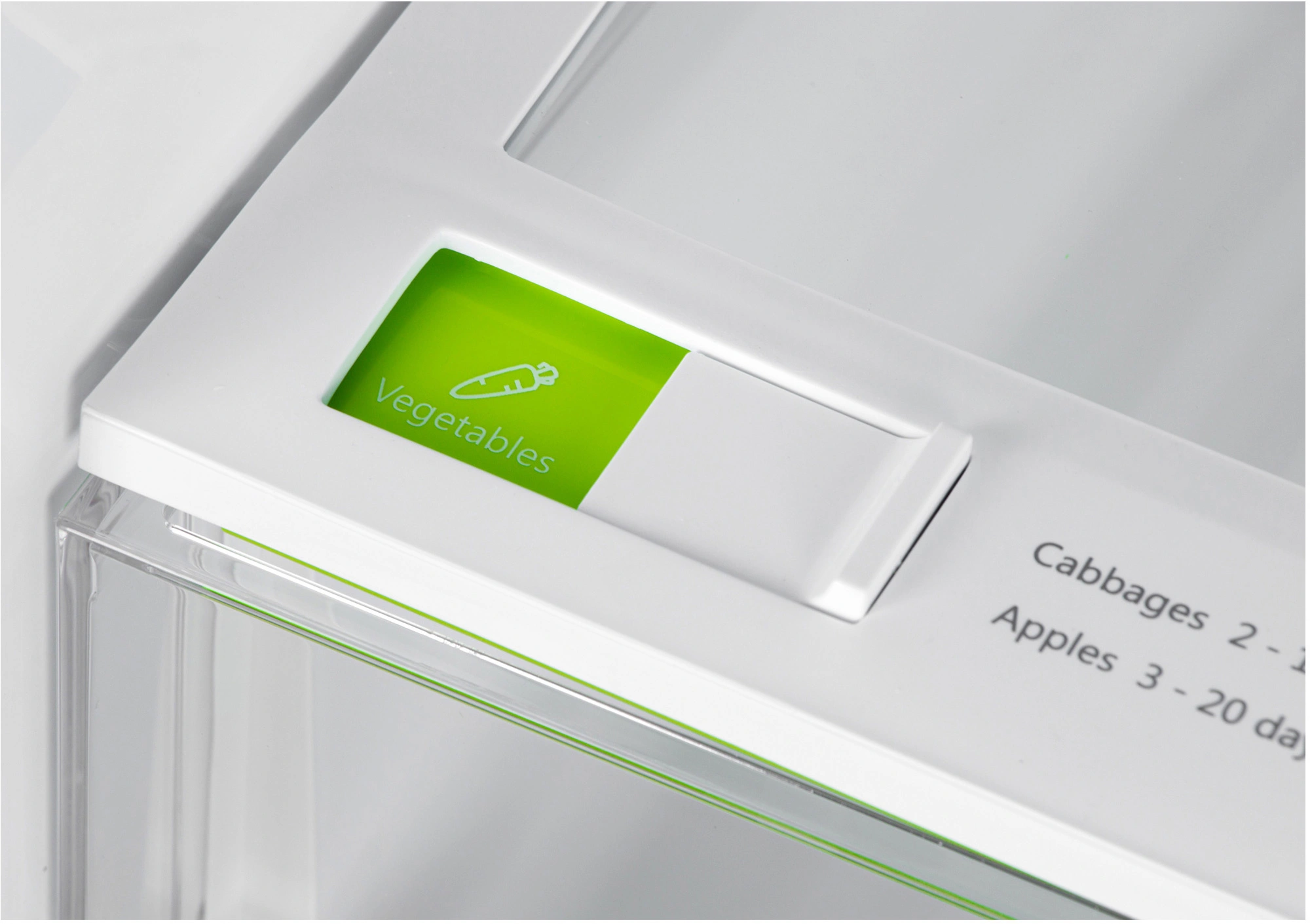 В холодильнике предусмотрены выдвижные полки и ящики для удобного хранения продуктов. Полки изготовлены из прочного стекла, которое выдерживает вес продуктов и легко моется. В холодильной камере есть зона свежести для хранения фруктов и овощей.