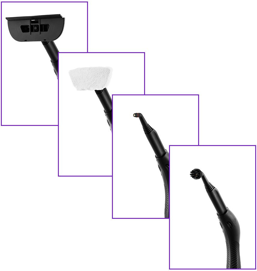 Скребок для стекла используется для чистки окон, зеркал, кафеля. Струйная насадка подходит для чистки плинтусов, щелей и других углов. Щётки - для удаления стойких загрязнений. С тряпкой можно отпаривать одежду, шторы, мягкую мебель. И это далеко не всё!