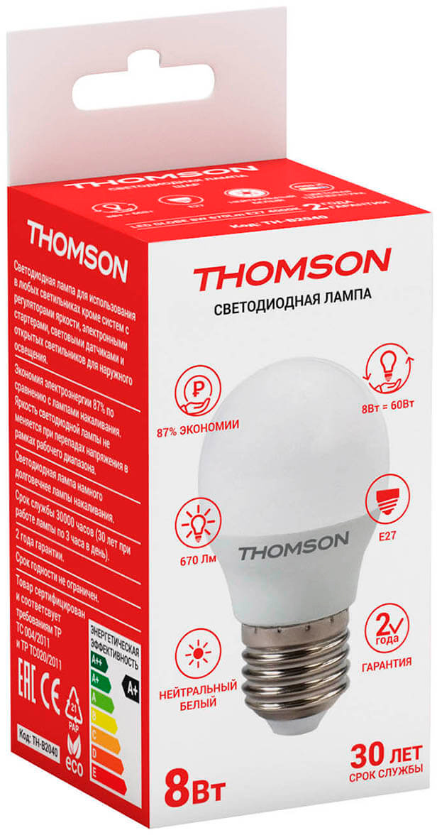 Светодиодная лампочка в форме шара с цоколем E27 и размерами 80 мм по высоте и диаметром в 50 мм обладает мощностью в 8 W, благодаря чему она может осветить 3 кв. м.
