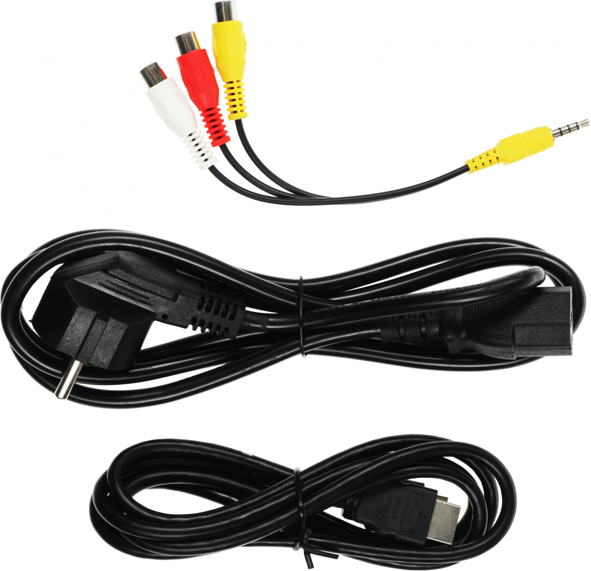 кабель HDMI 1.5м, 3,5 мм кабель AV, кабель питания, пульт ДУ, салфетка из микрофибры, руководство пользователя