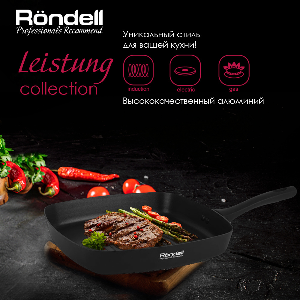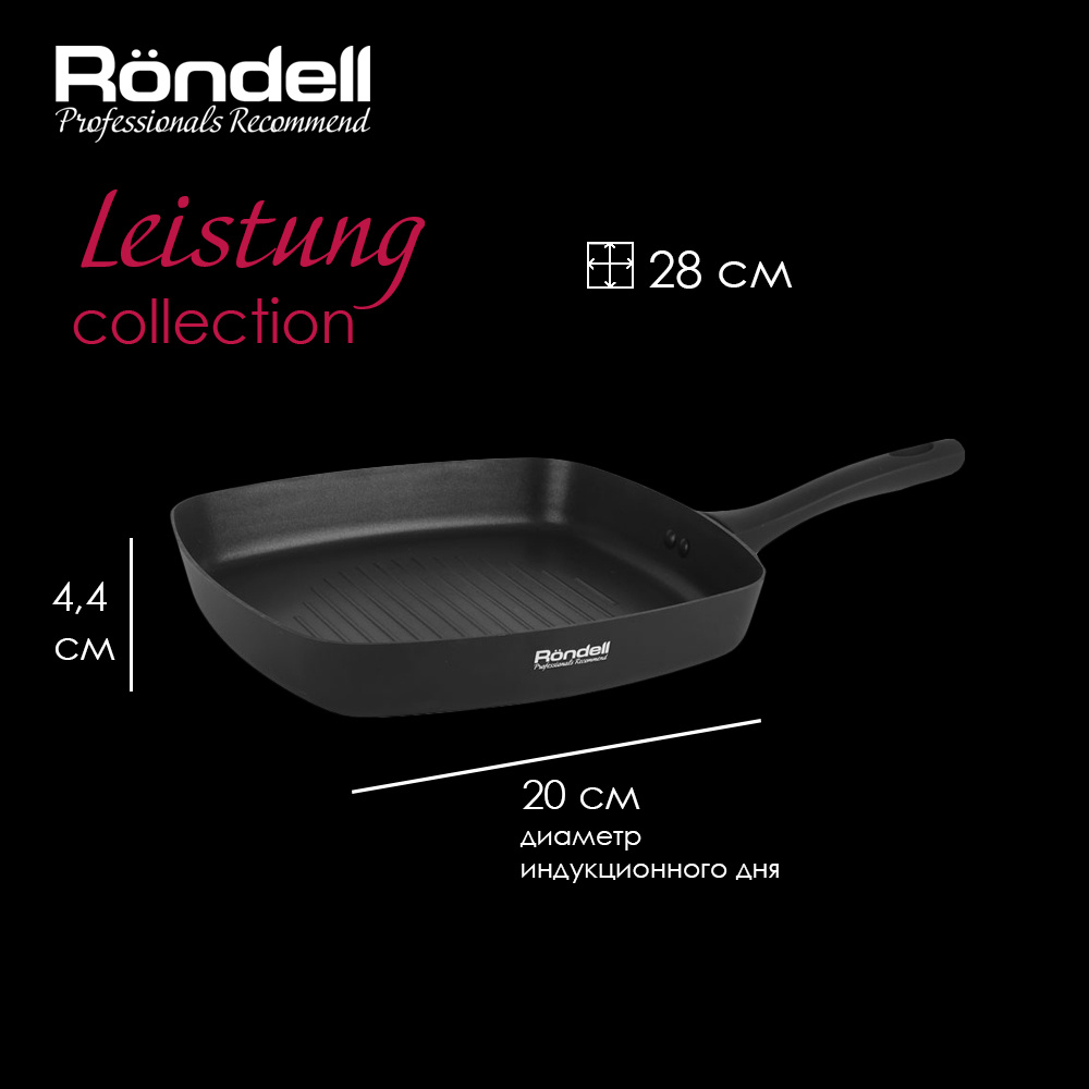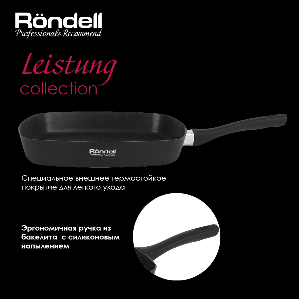 Сковорода-гриль Leistung изготовлена из надежного штампованного алюминия: она имеют внутреннее двухслойное антипригарное покрытие Xylan Plus® , благодаря которому продукты идеально прожариваются. За особый комфорт в работе отвечают бакелитовая ручка. Высочайшее качество, изысканный дизайн.