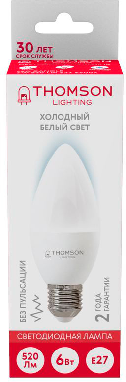 Светодиодная лампочка в форме свечи с цоколем E27 и размерами 100 мм по высоте и диаметром в 40 мм обладает мощностью в 6 W, благодаря чему она может осветить 2.5 кв. м. Цветовая температура – 6500 К, т.е. холодный свет синего оттенка