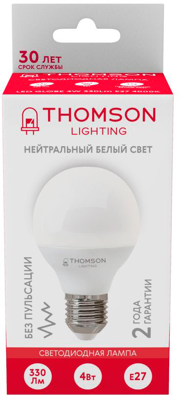 Светодиодная лампочка в форме шара с цоколем E27 и размерами 80 мм по высоте и диаметром в 50 мм обладает мощностью в 4 W, благодаря чему она может осветить 2 кв. м. Цветовая температура – 4000 К, т.е. белый свет, подходящий для рабочего настроя