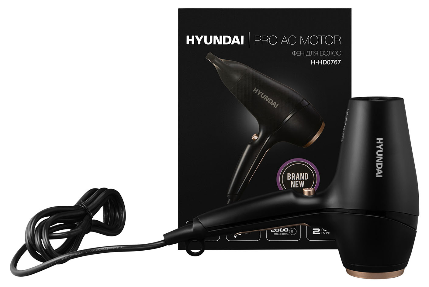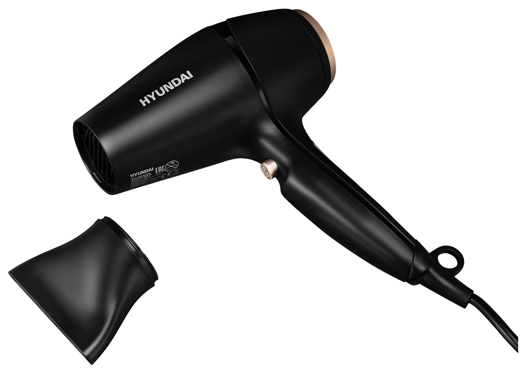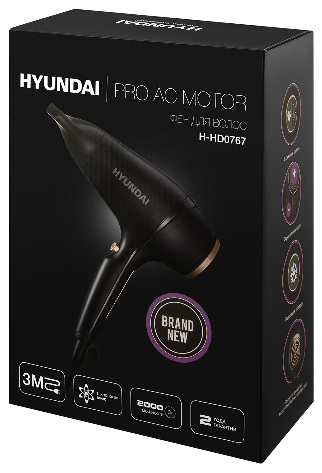 Чтобы быстро высушить волосы или сделать салонную укладку, отлично подойдёт фен Hyundai H-HDI0767 мощностью 2000 Вт. Он имеет два скоростных и три температурных режима, которые подходят для любого типа волос. Установлен нагревательный элемент с турмалиновым покрытием, а фильтр можно снять, почистить от мусора и пыли, а затем вставить обратно. Для более комфортного использования можно отдельно настроить воздушный поток и температурный режим, исходя из типа ваших волос. Режим подачи холодного воздуха и ионизация помогут сохранить укладку и сделают волосы эластичными и послушными. Если фен перегреется, то сработает защита от перегрева, и он отключится автоматически. Шнур имеет шарнирное крепление, благодаря чему он не перекручивается, а кольцо для подвешивания позволяет разместить фен на крючке в ванной. В комплекте идёт одна насадка-концентратор.