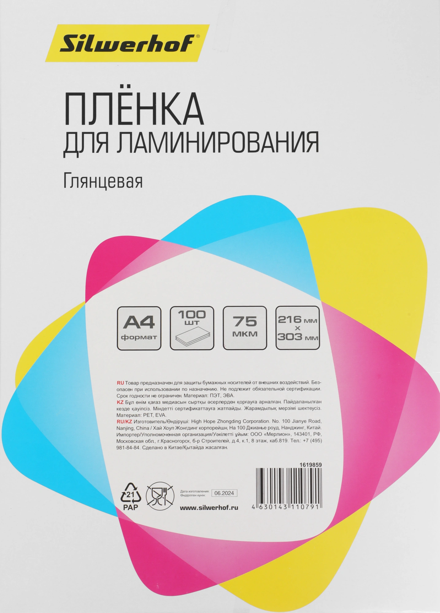 Пленка для ламинирования Silwerhof 75мкм A4 (100шт) глянцевая 216x303мм