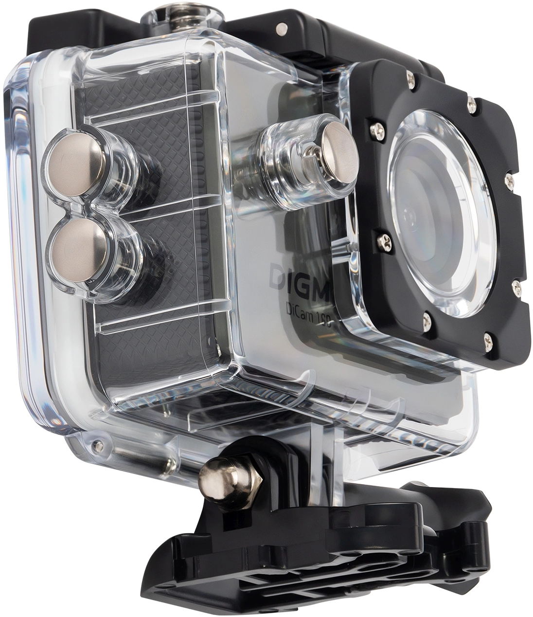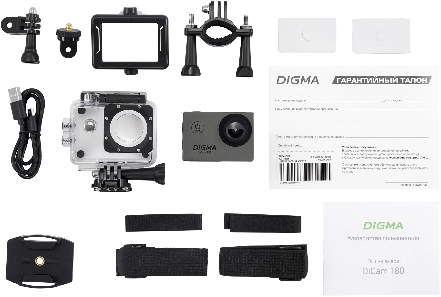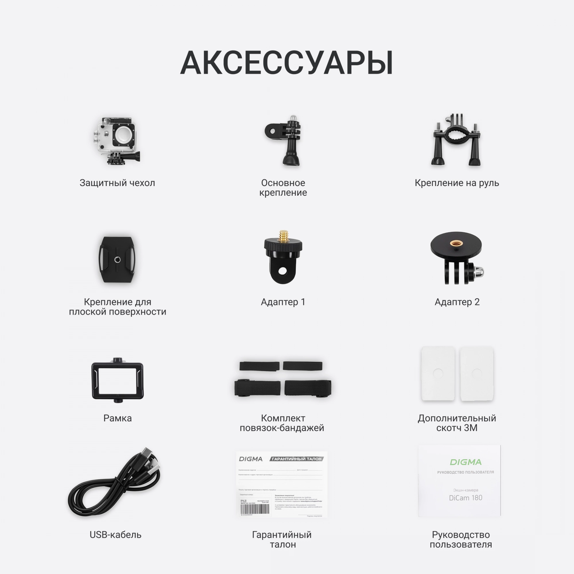 Экшен-камера Digma DiCam 180 – современная функциональная модель. В комплект с гаджетом входят: USB-кабель, крепления на шлем и для штатива, водонепроницаемый корпус, повязка-бандаж, основное крепление, крепление для плоской поверхности, рамка, крепление на руль, две двухсторонние самоклеящиеся ленты.