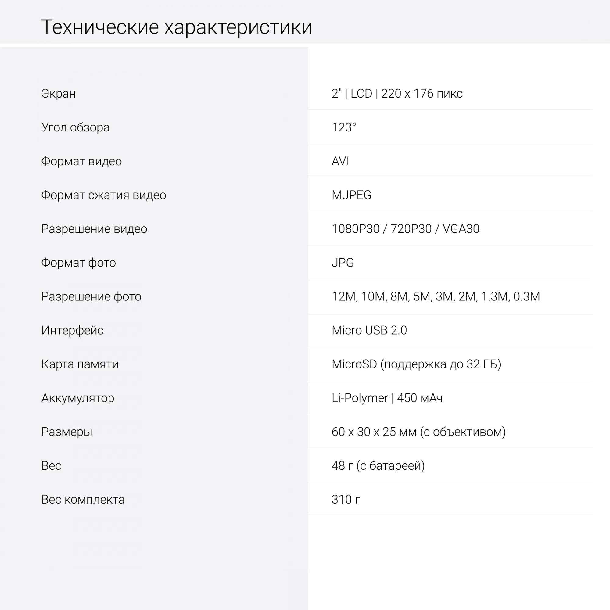 Устройство поддерживает карты памяти формата microSD объемом до 32 Гб. Встроенный микрофон позволяет записывать голос и окружающие звуки для полноценной видеосъемки.