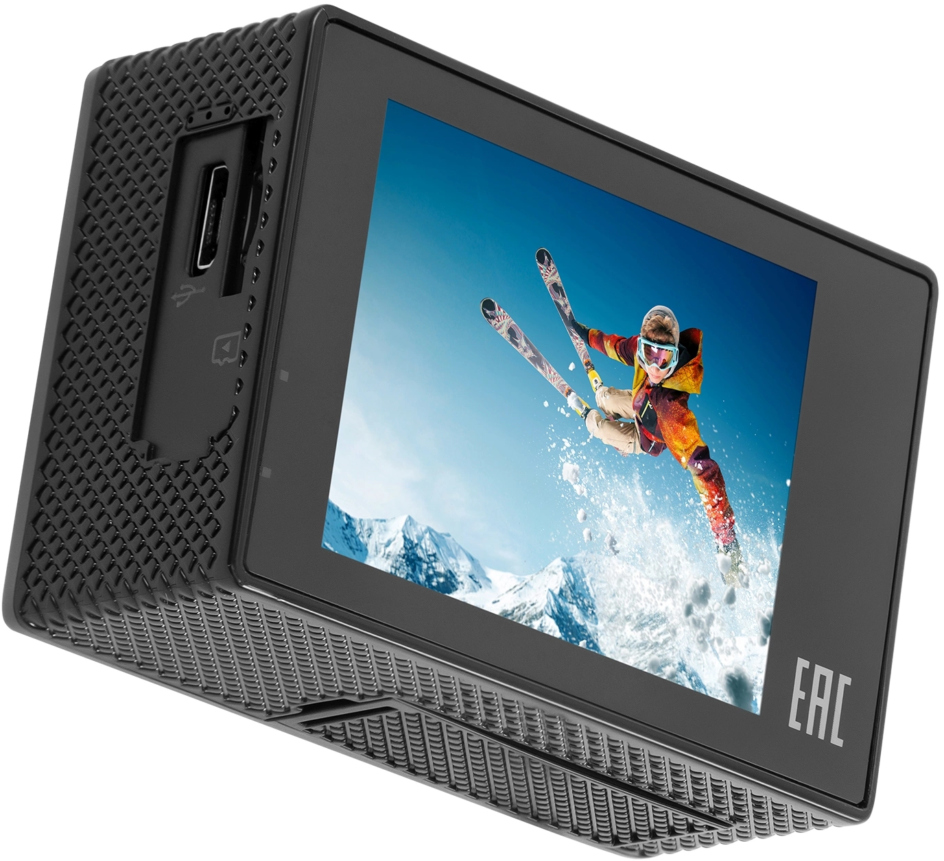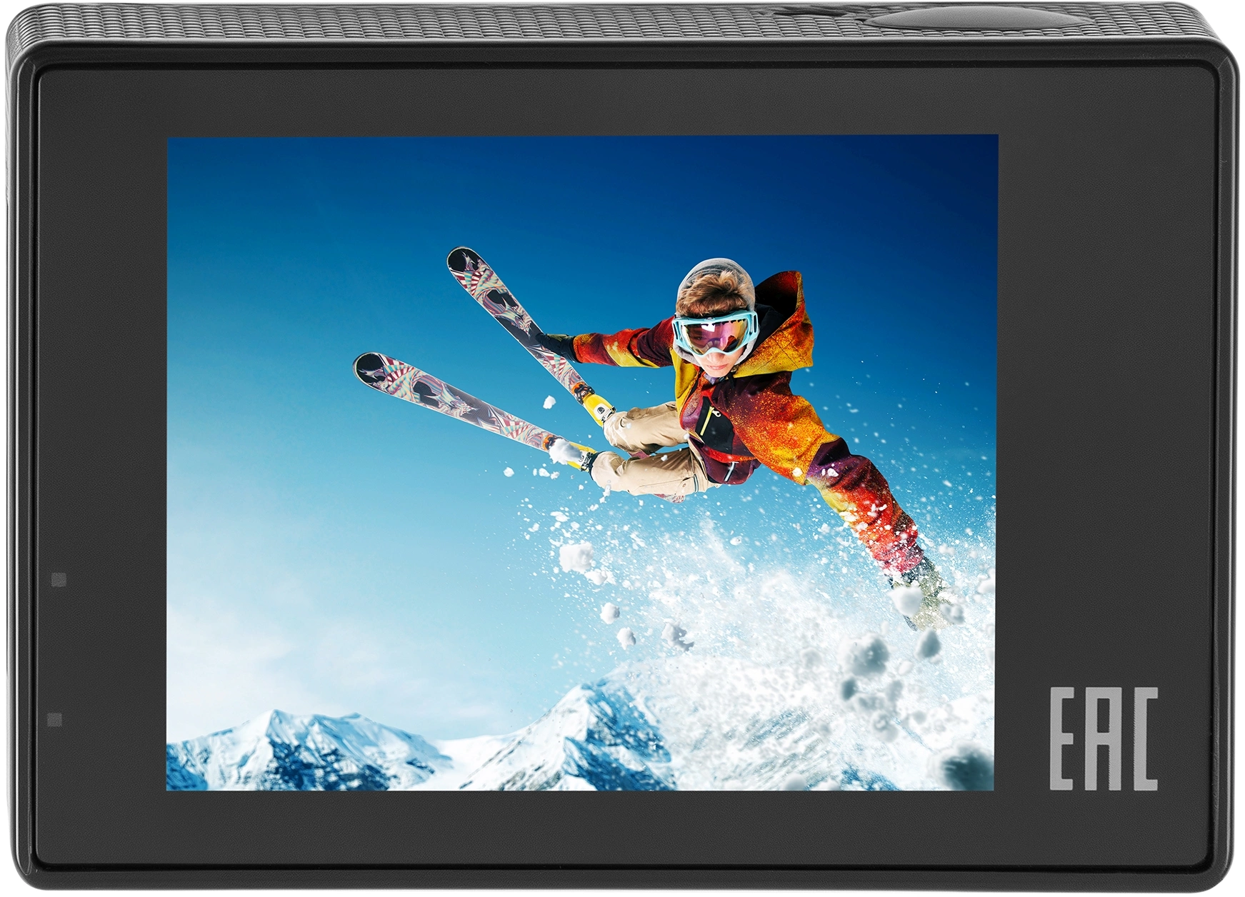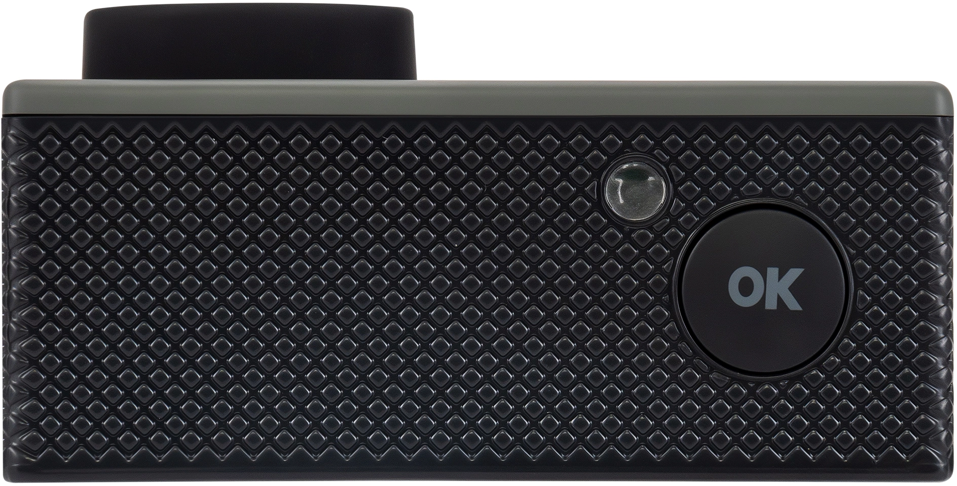 Экшен-камера представлена в лаконичном дизайне и классическом сером цвете. Устройство выполнено из прочного и долговечного пластика для съемки в самых экстремальных условиях.