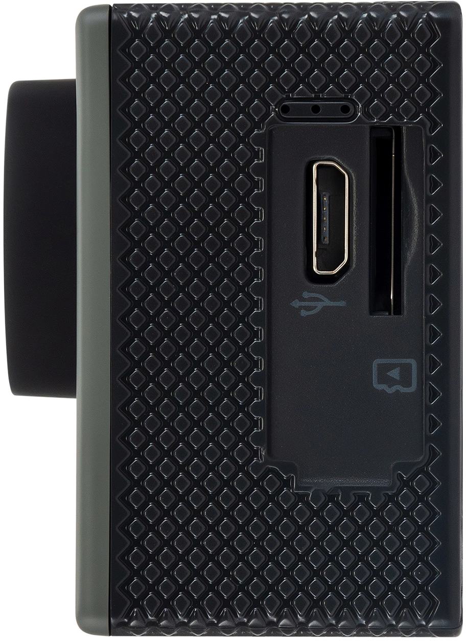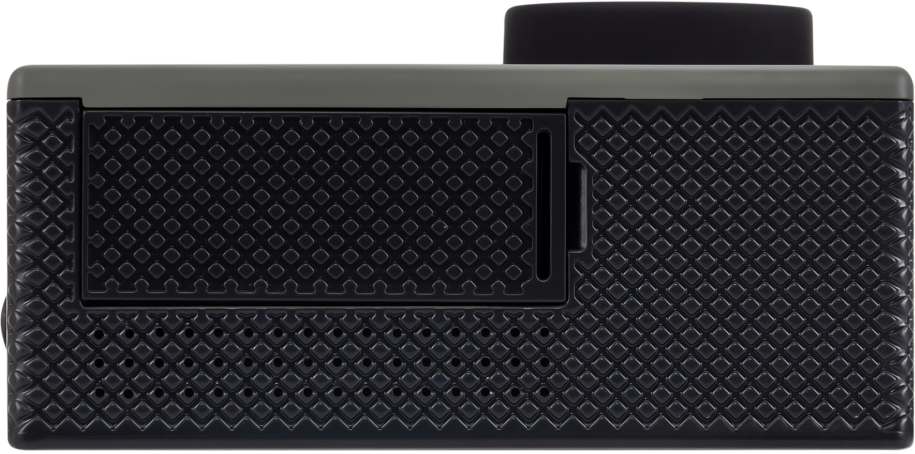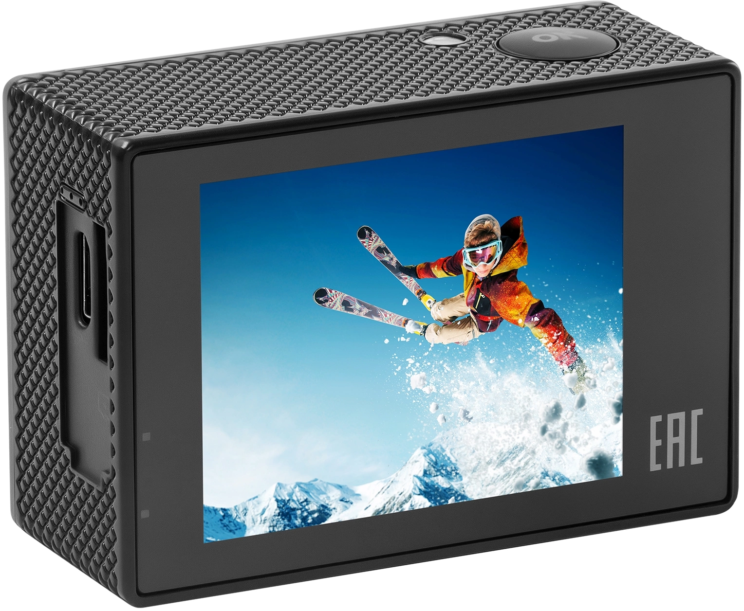 Экшен-камера представлена в лаконичном дизайне и классическом сером цвете. Устройство выполнено из прочного и долговечного пластика для съемки в самых экстремальных условиях.