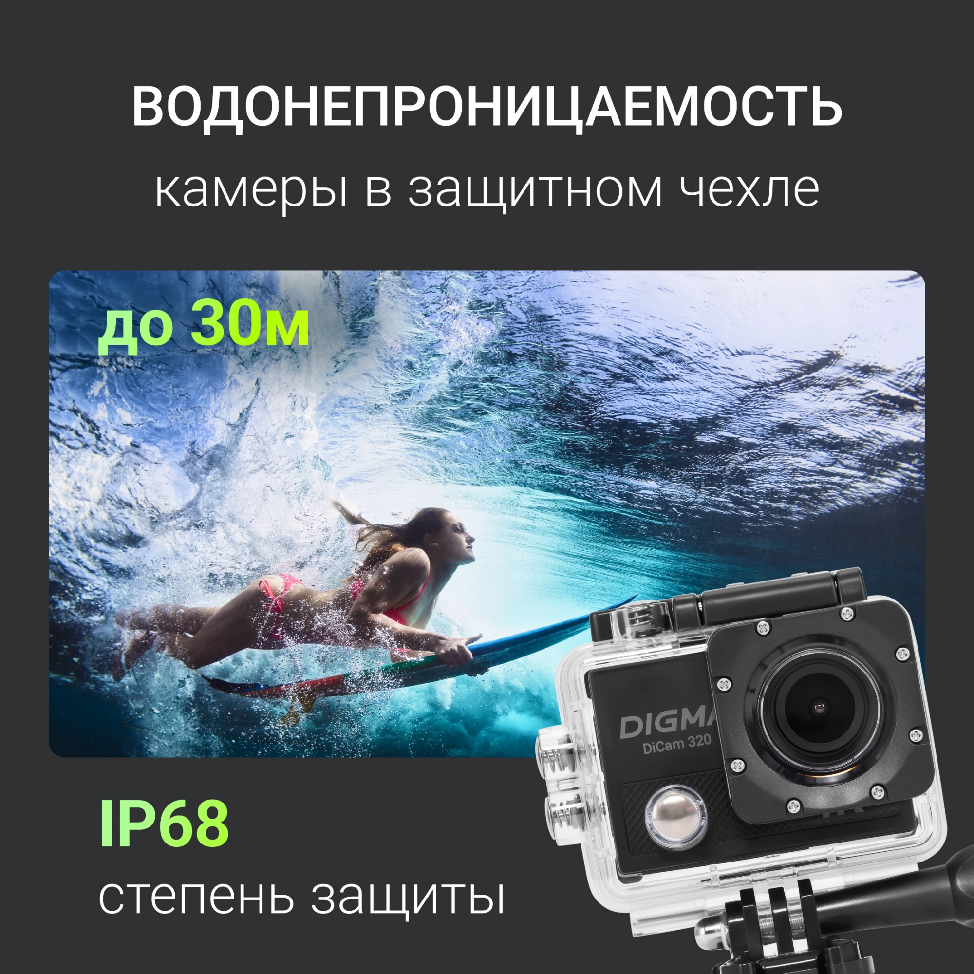 Экшен-камера Digma DiCam 320 – устройство для цифровой съемки в самых непредвиденных условиях. Камера поддерживает видеозапись в формате MP4 в высоком разрешении 4К (3840 х 2160 pix). Как результат – качественные видеоролики с лучшей детализацией. Широкий угол обзора 140° помогает запечатлеть больше пейзажей. Водонепроницаемый кейс дает возможность проводить съемку под водой – во время плавания, рыбалки, дайвинга.