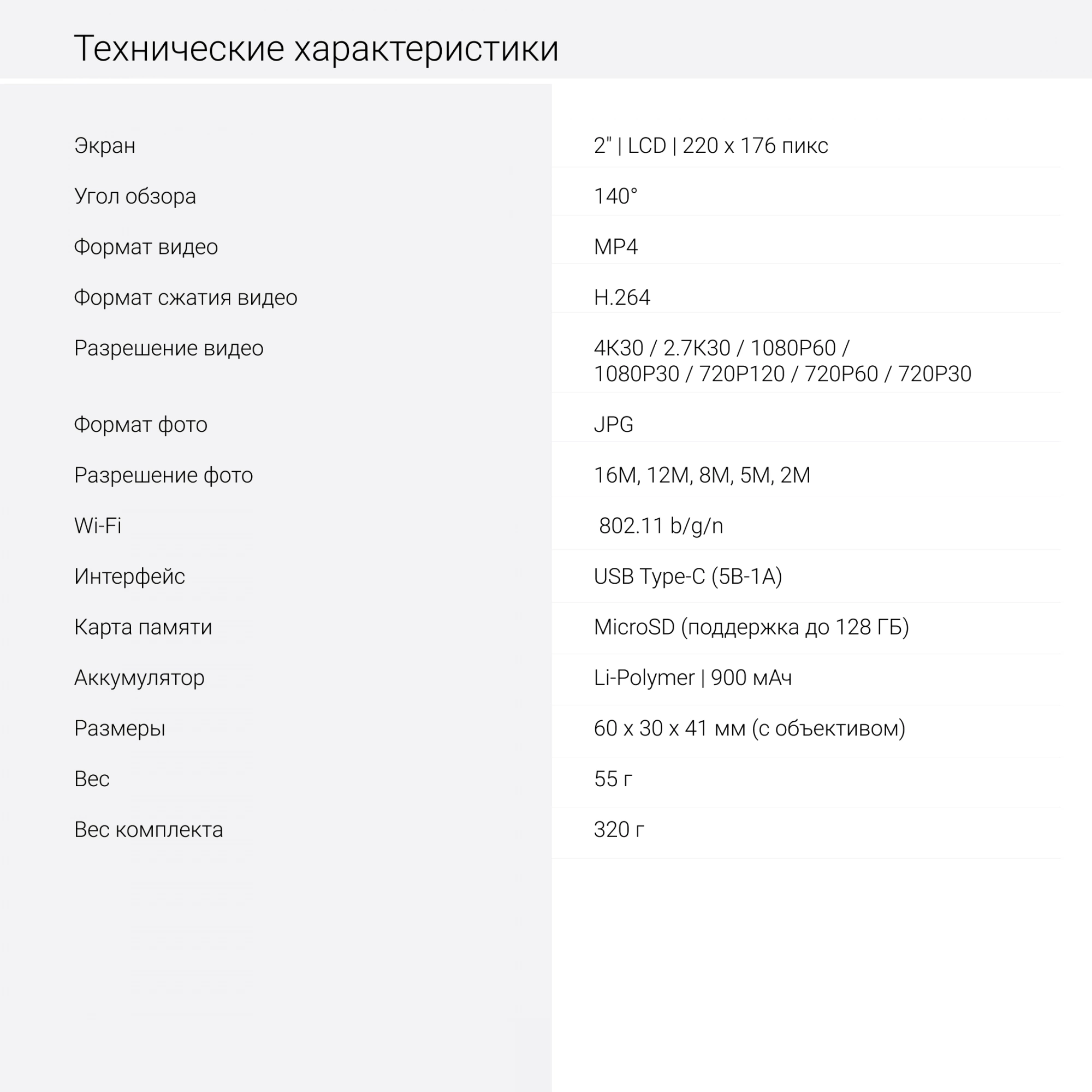 Камера весит всего 43 г, поэтому ее всегда можно взять с собой в путешествие, туристическую поездку, поход. Встроенный микрофон обеспечивает запись голоса и звуков для полноценной съемки.