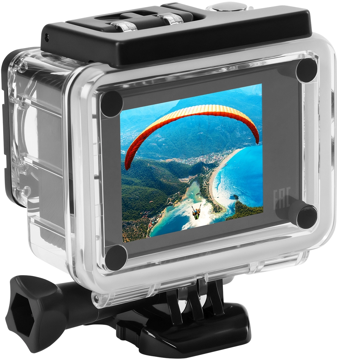 Камера изготовлена из долговечного и прочного пластика для съемки в экстремальных условиях. В комплектацию входят: крепления на шлем и для штатива, водонепроницаемый корпус, USB-кабель, повязка-бандаж, основное крепление, крепление для плоской поверхности, рамка, крепление на руль, две двухсторонние самоклеящиеся ленты.
