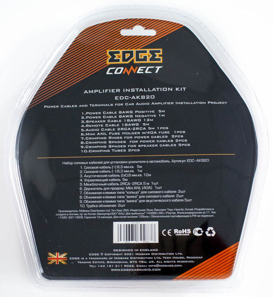 Кабель силовой (+) 8Ga - 5м; кабель силовой (-) 8Ga - 1м; акустический кабель 16Ga - 12м; управляющий кабель 18Ga - 5м; кабель 2RCA-2RCA - 5м; держатель для предохр. Mini-ANL - 1шт; предохраниитель Mini-ANL; кольцо обжимное 8Ga - 2шт; вилки обжимные: 8Ga - 2шт, 16Ga - 5шт; трубка обжимная - 2шт