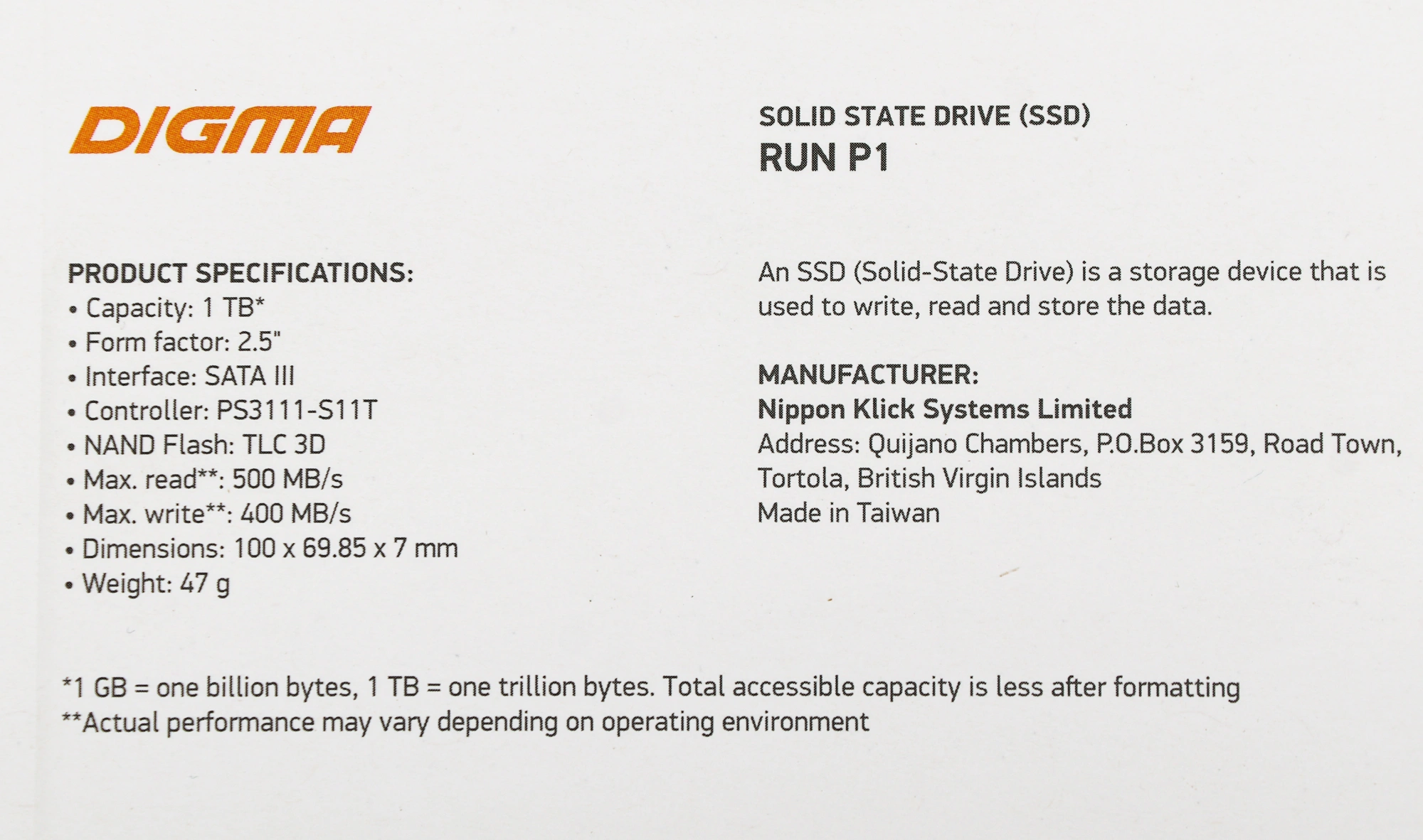 Модель создана на базе производительного тайваньского чипсета Phison PS3111-S11T. В устройстве также используется новейшая технология высокоскоростной флеш-памяти с многослойной структурой TLC 3D NAND. Она обеспечивает диску отличные показатели скорости и выносливости. Благодаря впечатляюще внушительной емкости в 1 ТБ накопитель идеально подходит для хранения огромного количества популярных игр и ресурсоемких программ для обработки фото и видео. Digma RUN P1 обладает невероятно большим ресурсом перезаписи TBW: он составляет 500 ТБ.