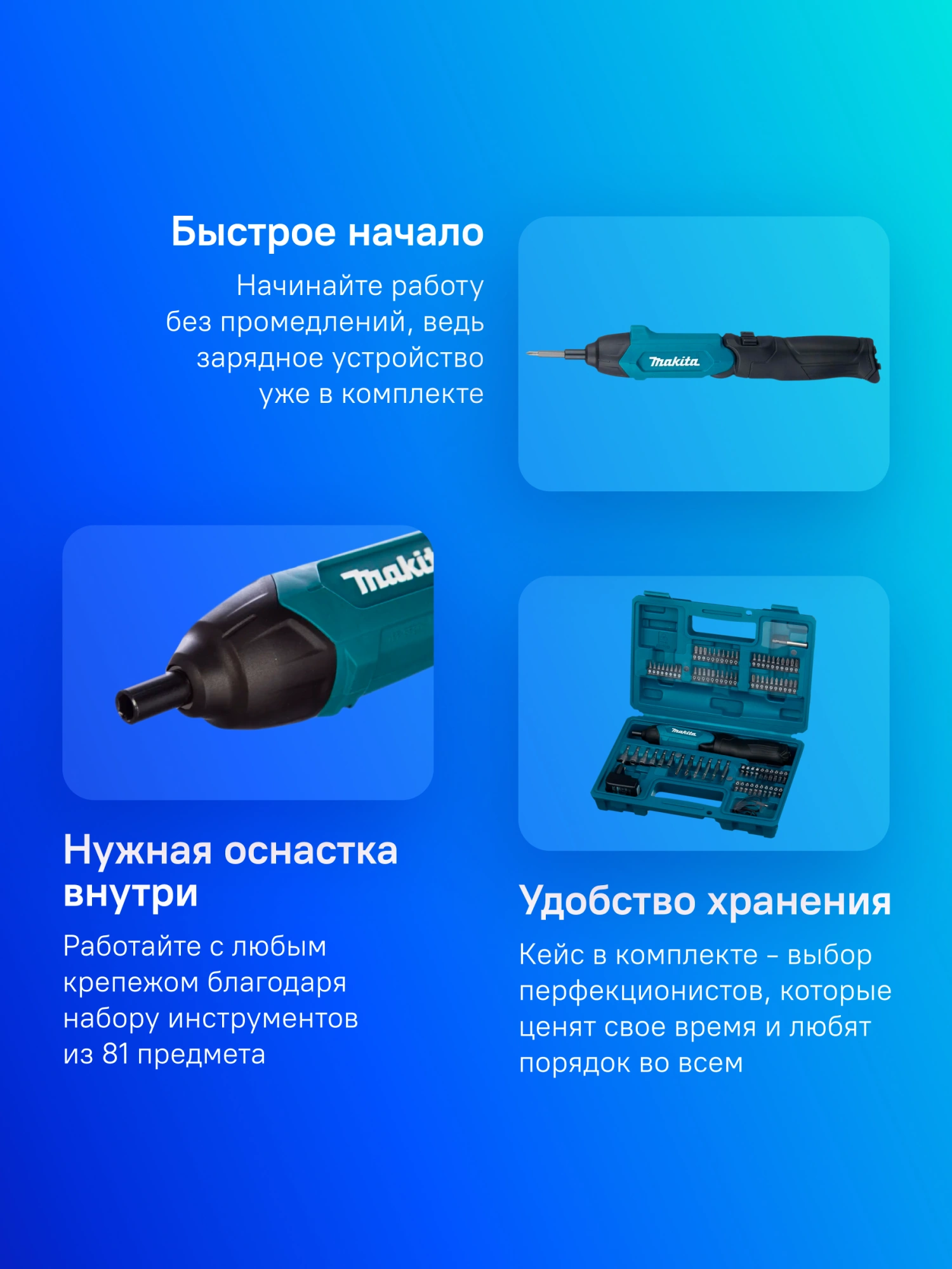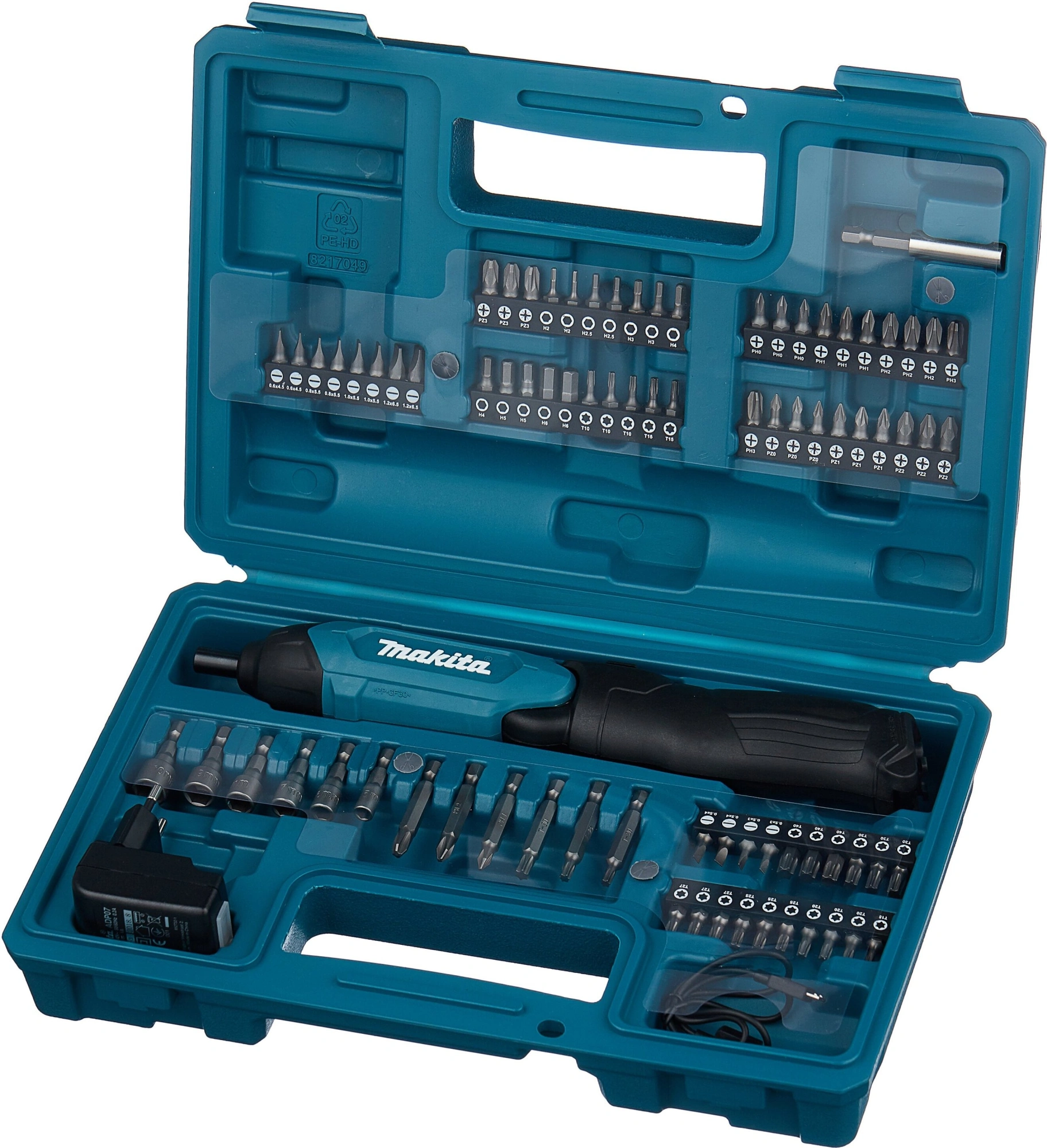 Отвертка; зарядное устройство; USB шнур; комплект аксессуаров (81 шт.); чемодан.