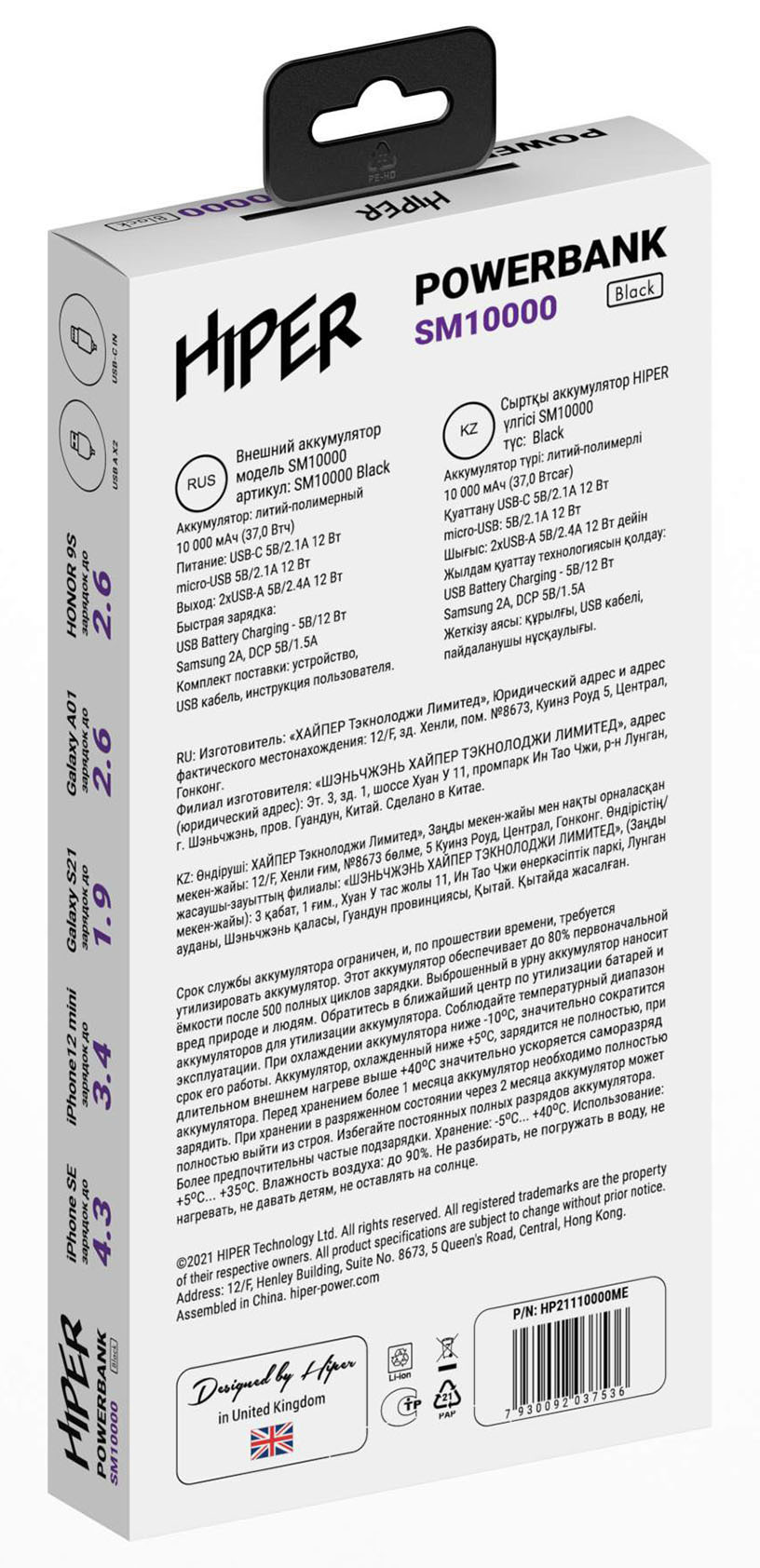 Портативный внешний аккумулятор емкостью 10000 мАч (37Втч) оснащён входом USB-C для зарядки, Micro-USB входом для зарядки, 2xUSB-A выходами, максимальный выходной ток 2,1А, максимальная мощность 12 Вт.