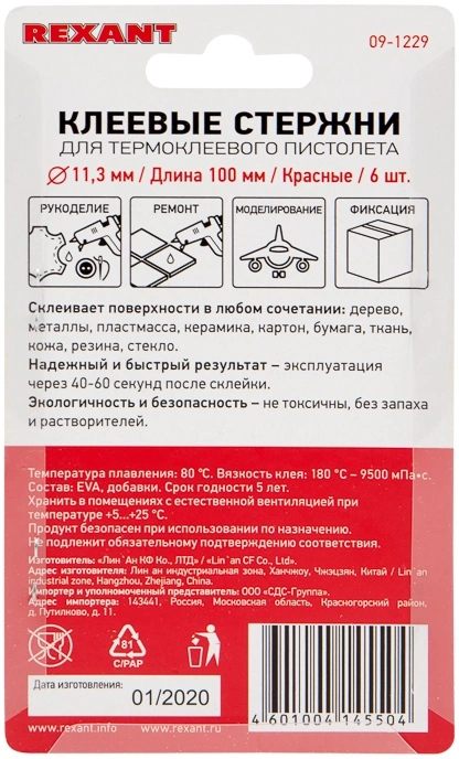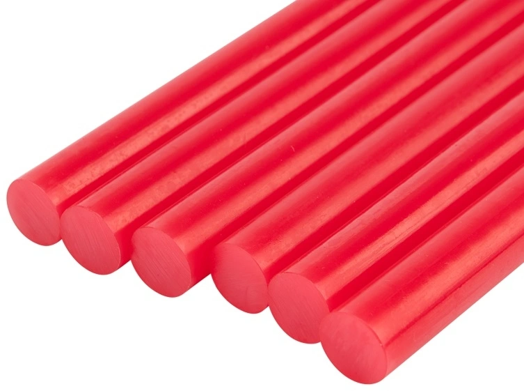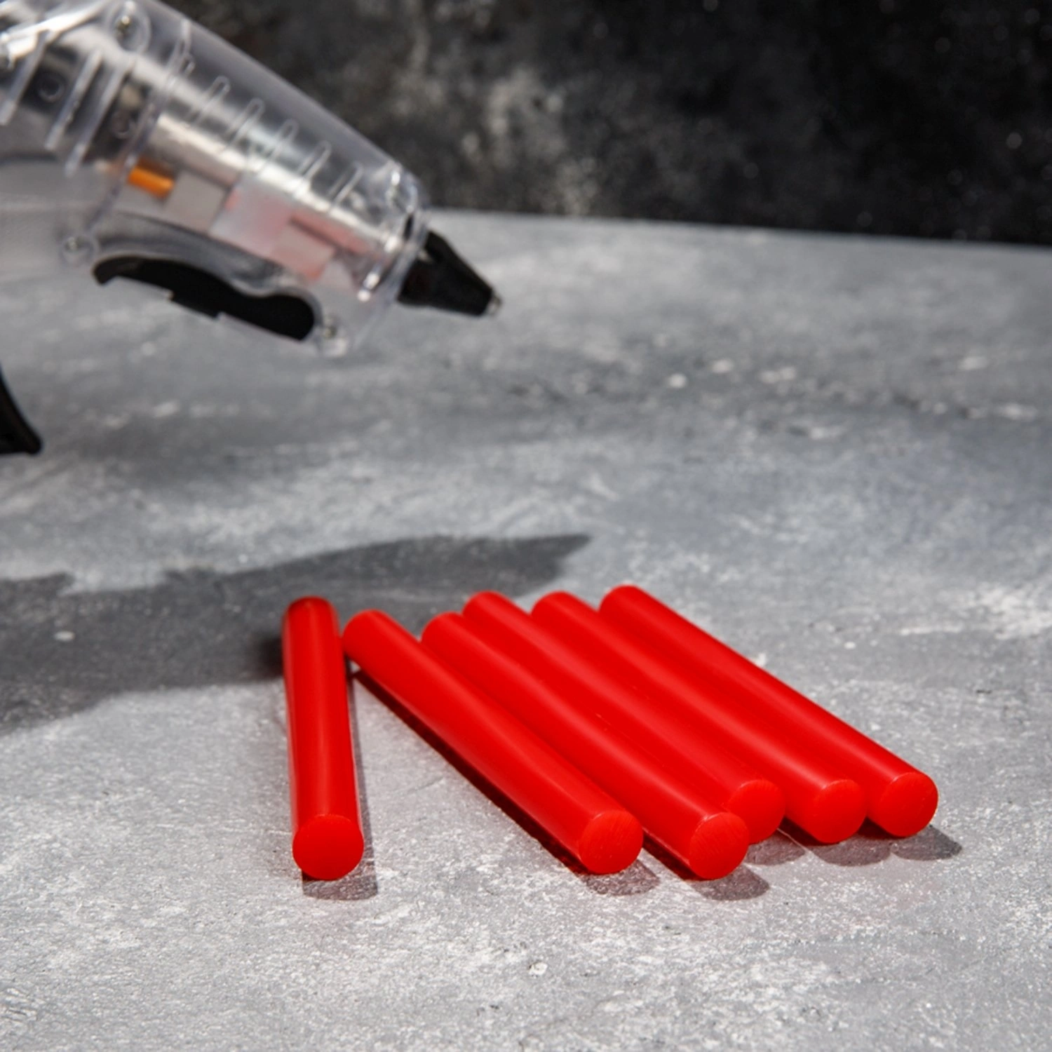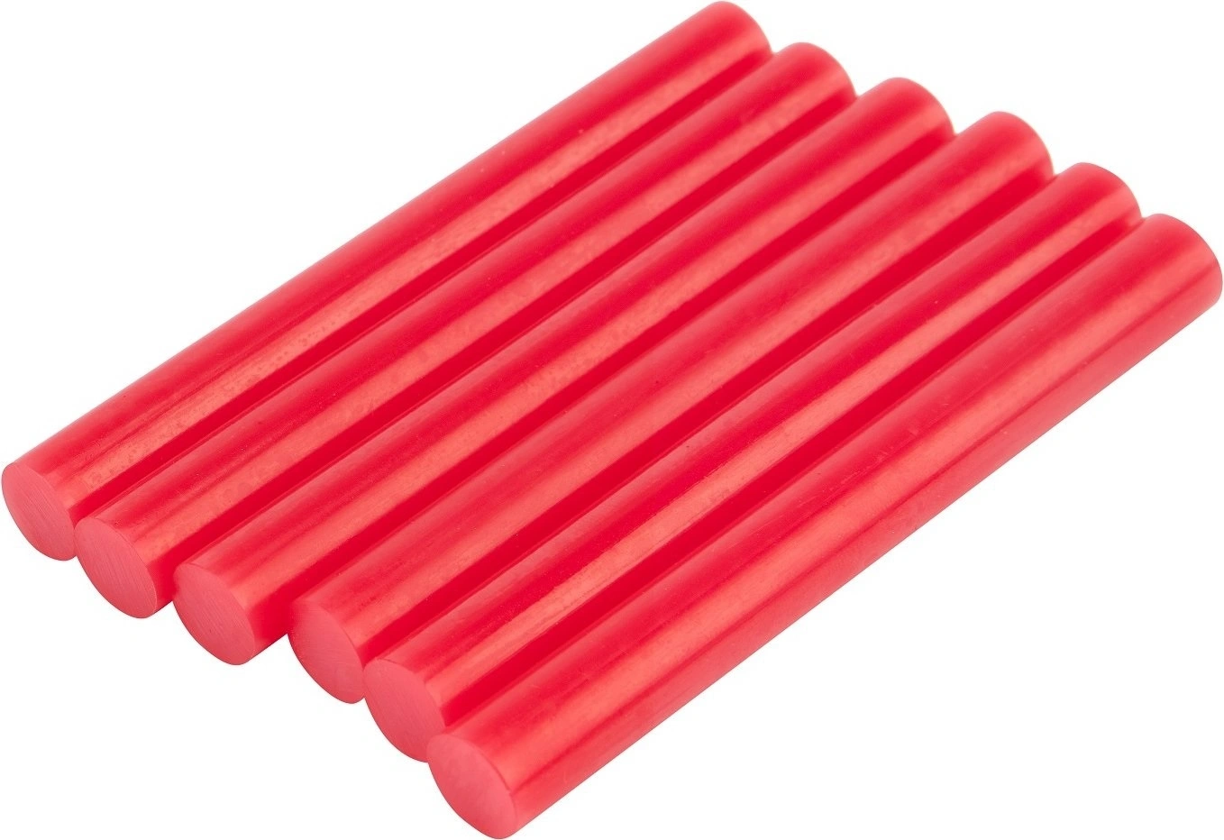 Набор из 6 клеевых стержней красного цвета диаметром 11 мм. и длиной 100 мм подойдет для работы с деревом, картоном, пластмассой, стеклом, бумагой, керамикой, металлом, кожей и тканью. Термоклей не имеет запаха, не токсичен. Время застывания: 40-60 с. Температура плавления: от +80 градусов Цельсия.