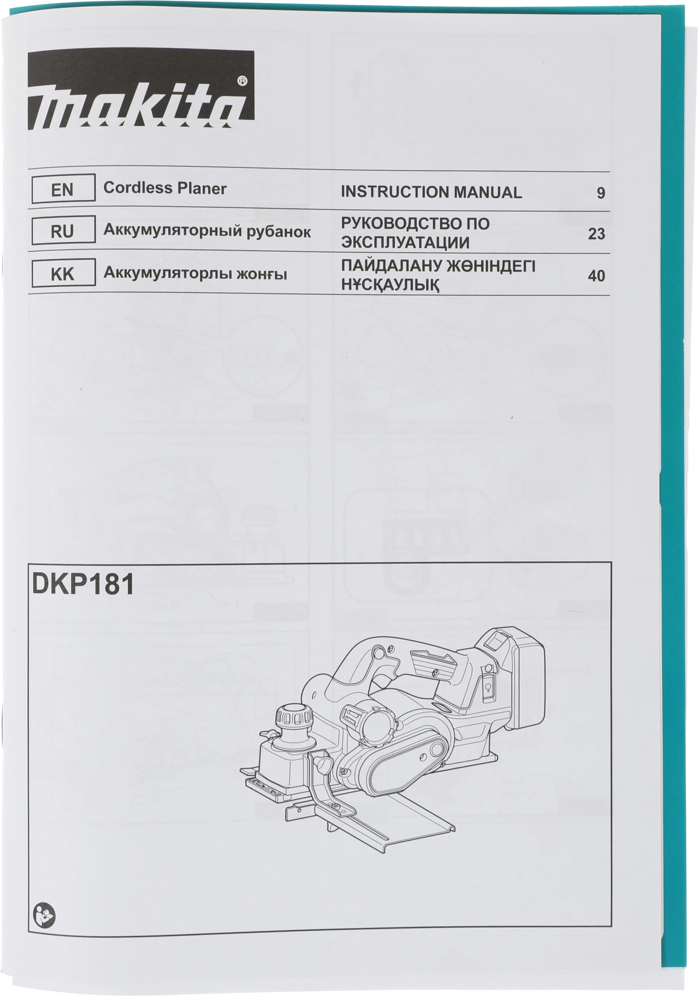 Аккумуляторный рубанок, твёрдосплавный нож, держатель для заточки ножа, патрубок для пылесоса, калибр для установки ножа, параллельный упор, торцeвoй ключ 9.