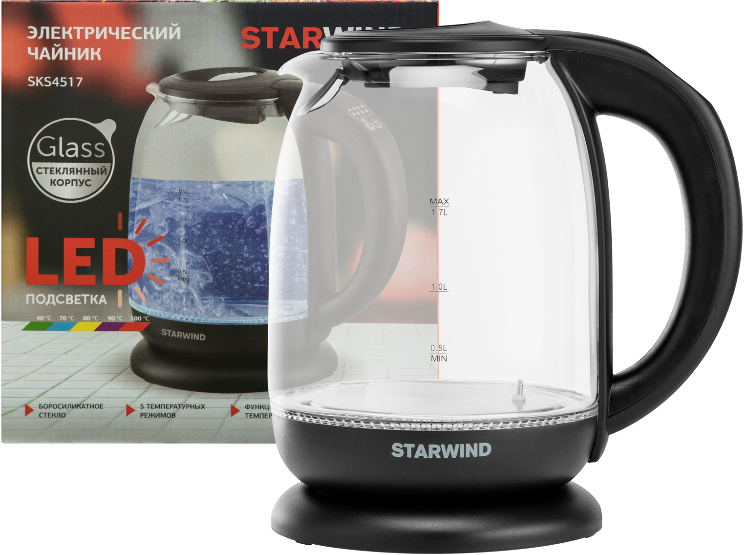 1.7л. 2200Вт черный корпус: стекло/пластик