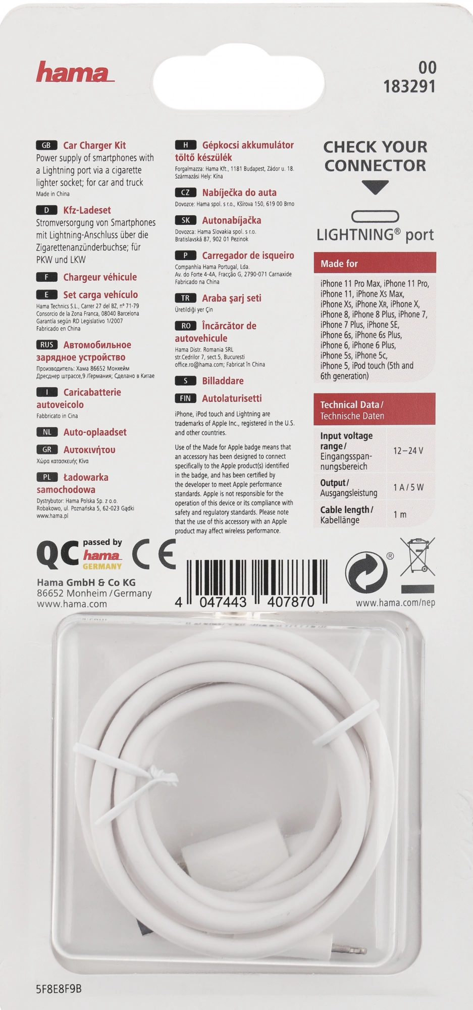 Комплект для зарядки прикуривателя Hama , Lightning, 1 А, белый.
