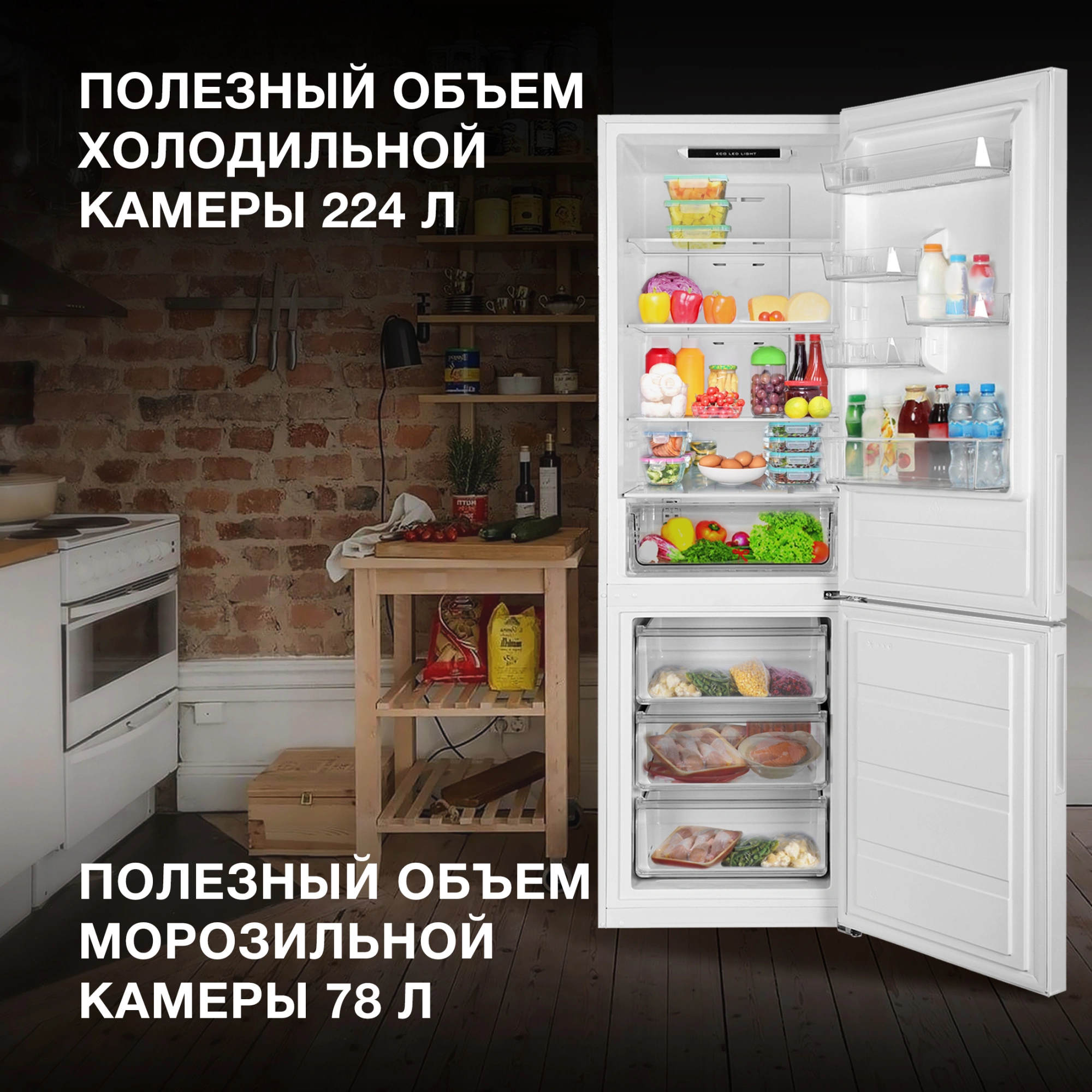 Общий объем холодильника составляет 310 литров, из которых 302 литра — полезный объем, что делает его отличным выбором для семейных нужд. Холодильная камера имеет полезный объем 224 литра и оснащена системой No Frost, которая предотвращает образование льда и обеспечивает равномерное охлаждение. 4 полки из закалённого стекла обеспечивают удобное и безопасное размещение продуктов.