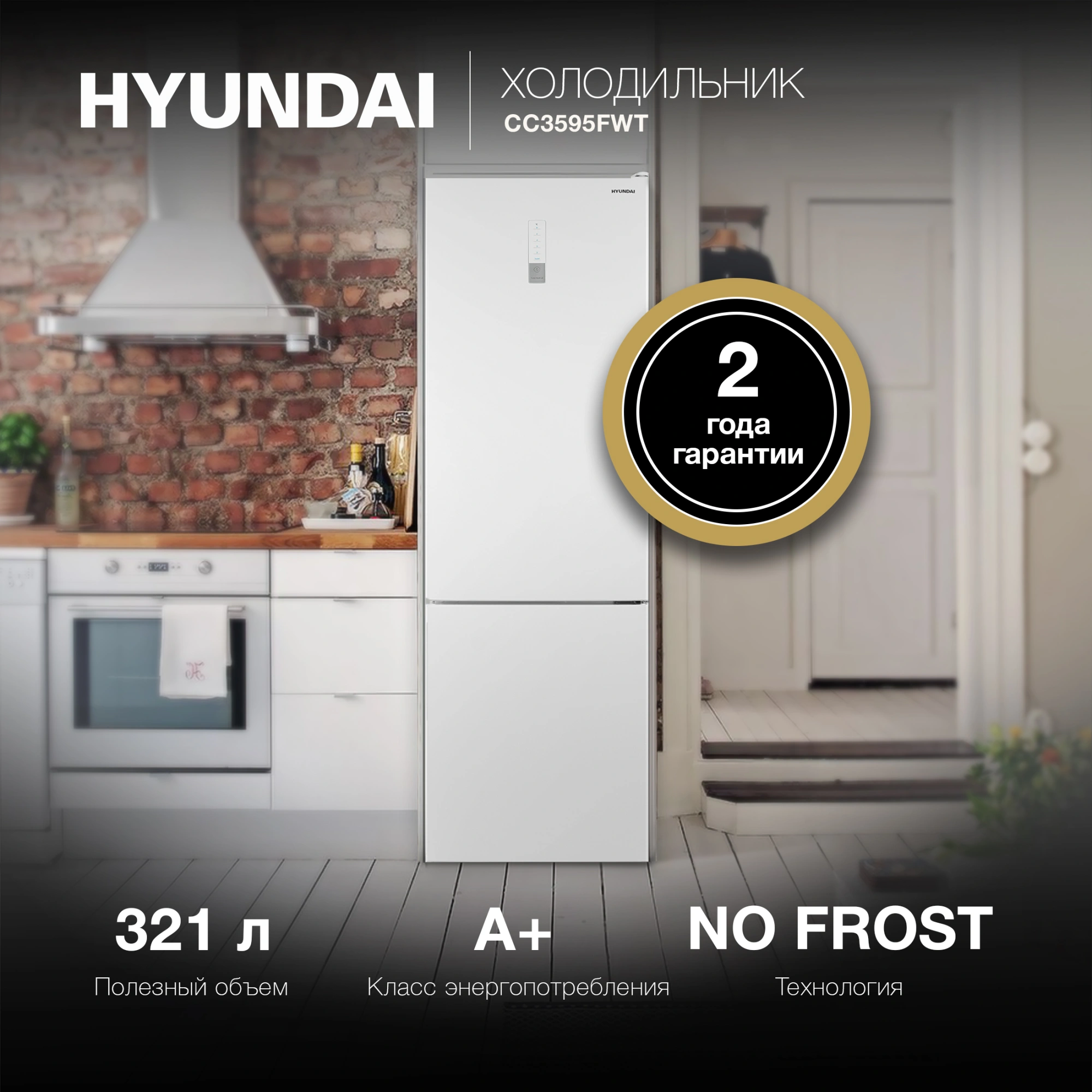 Холодильник HYUNDAI CC3595FWT – удачный выбор для семьи. Он позволяет сохранить свежесть и полезные вещества в продуктах и готовых блюдах. Двухкамерный прибор имеет нижний морозильник, объем которого составляет 76 л. Поддерживает функцию суперзаморозки с производительностью 4 кг/сут. В холодильной камере, оборудованной 4 полками из закаленного стекла, применяется суперохлаждение. Устройство относится к классу А+ по энергопотреблению. В год его потребление энергии не превышает 328 кВт*ч. В обеих камерах применяется автоматическая система размораживания No Frost. Дисплей и индикатор температуры помогают контролировать работу устройства. При отключении электроэнергии холодильник сохраняет продукты охлажденными в течение 9 часов.