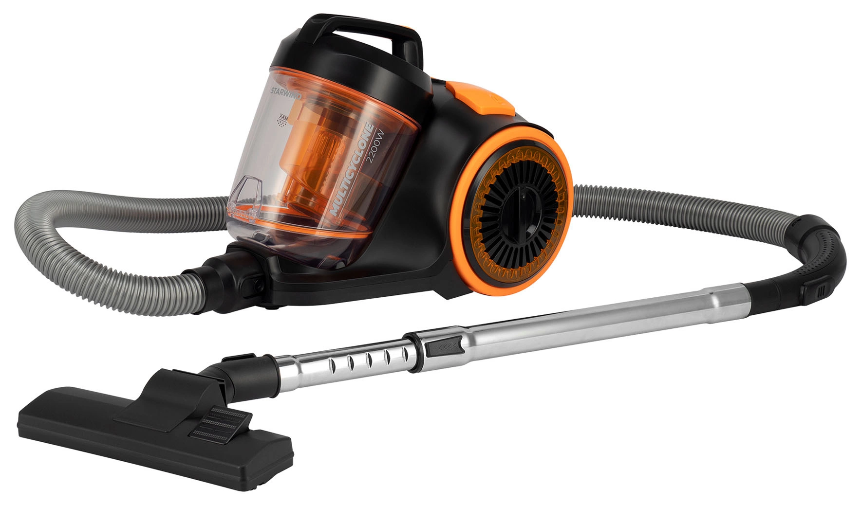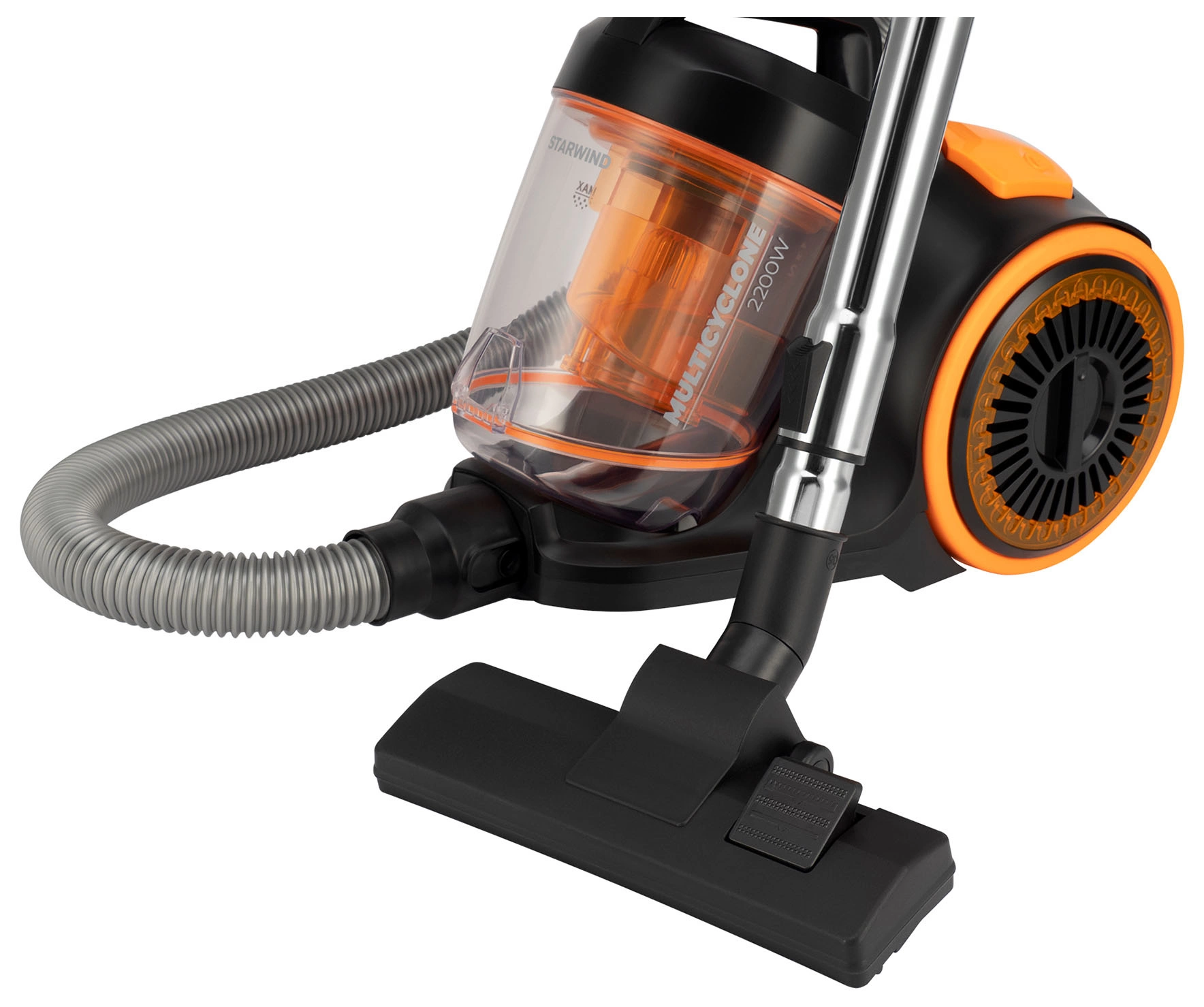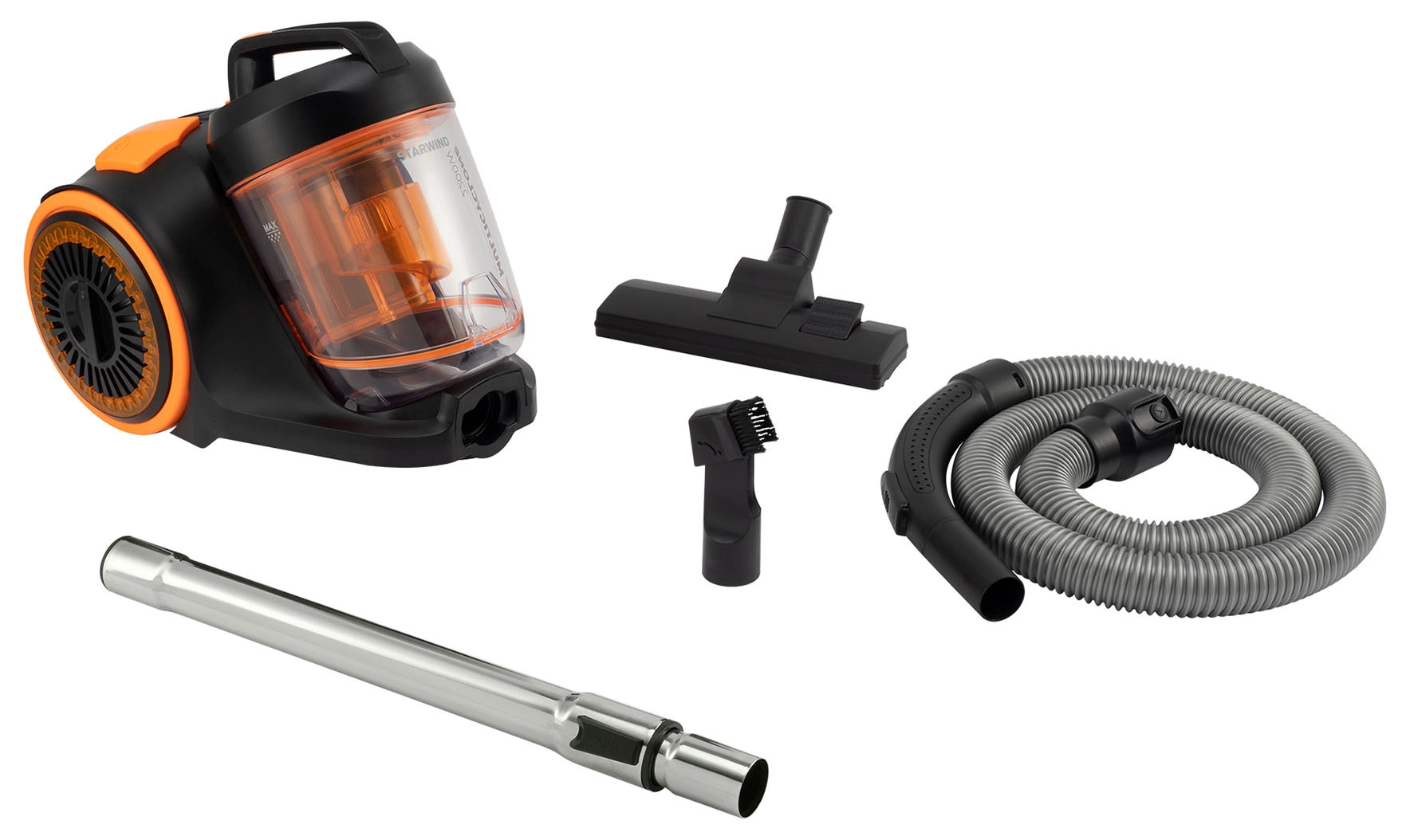 Пылесос Starwind SCV2285 2200W отличается компактностью и маневренностью. Благодаря прорезиненным колесикам увеличенного размера отлично преодолевает препятствия. Подходит для любого типа покрытий. В комплект входят насадка для уборки пола и ковров, а также щелевая насадка, которая имеет компактную щеточку для уборки мебели и труднодоступных мест. Мощности всасывания в 350 Вт вполне хватает, чтобы справиться с пылью, песком, шерстью животных, а также экономит электроэнергию. Пылесборник имеет объем 3,5 л, выполнен из прозрачного пластика. Это позволяет следить за степенью наполнения. Система циклон гарантирует надежную фильтрацию воздуха на выходе. Есть стакан для сбора мусора, фильтр тонкой очистки и моторный фильтр. Длина шнура более чем достаточная, составляет 5 метров. Он сматывается автоматически, с помощью кнопки на корпусе.