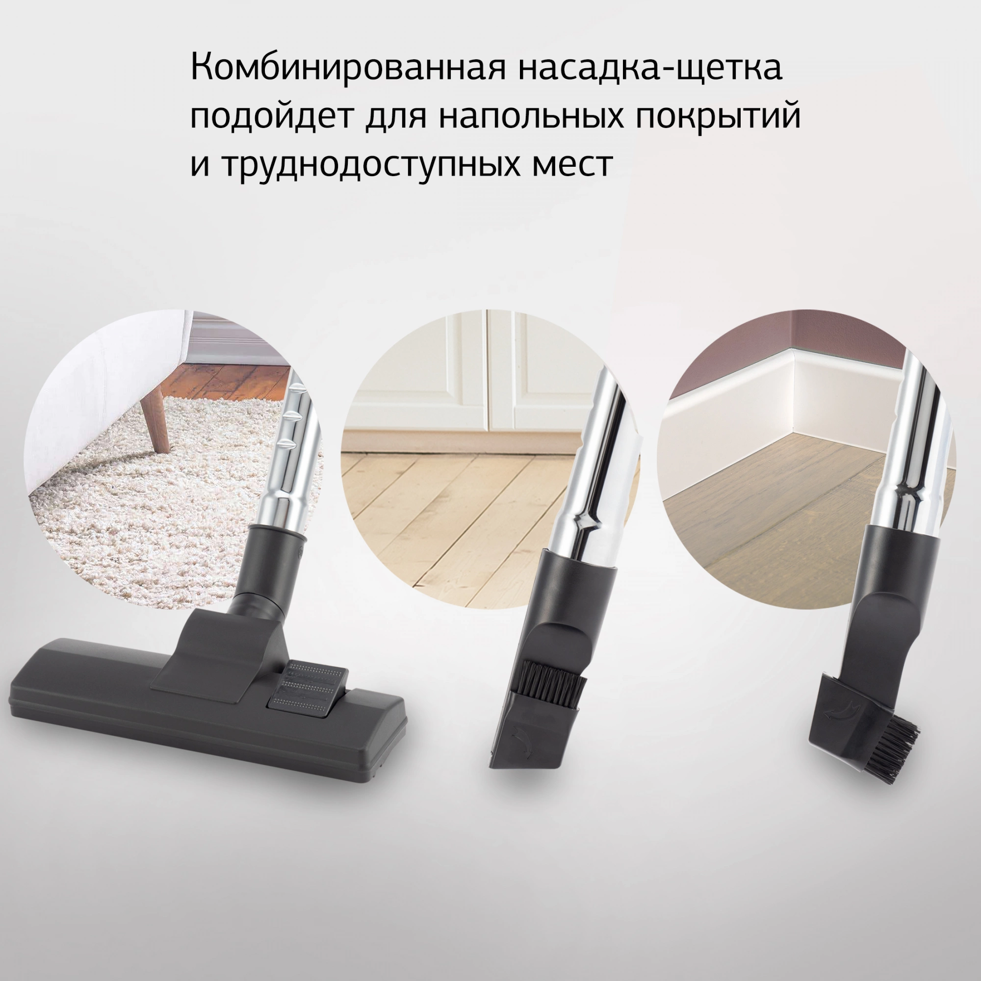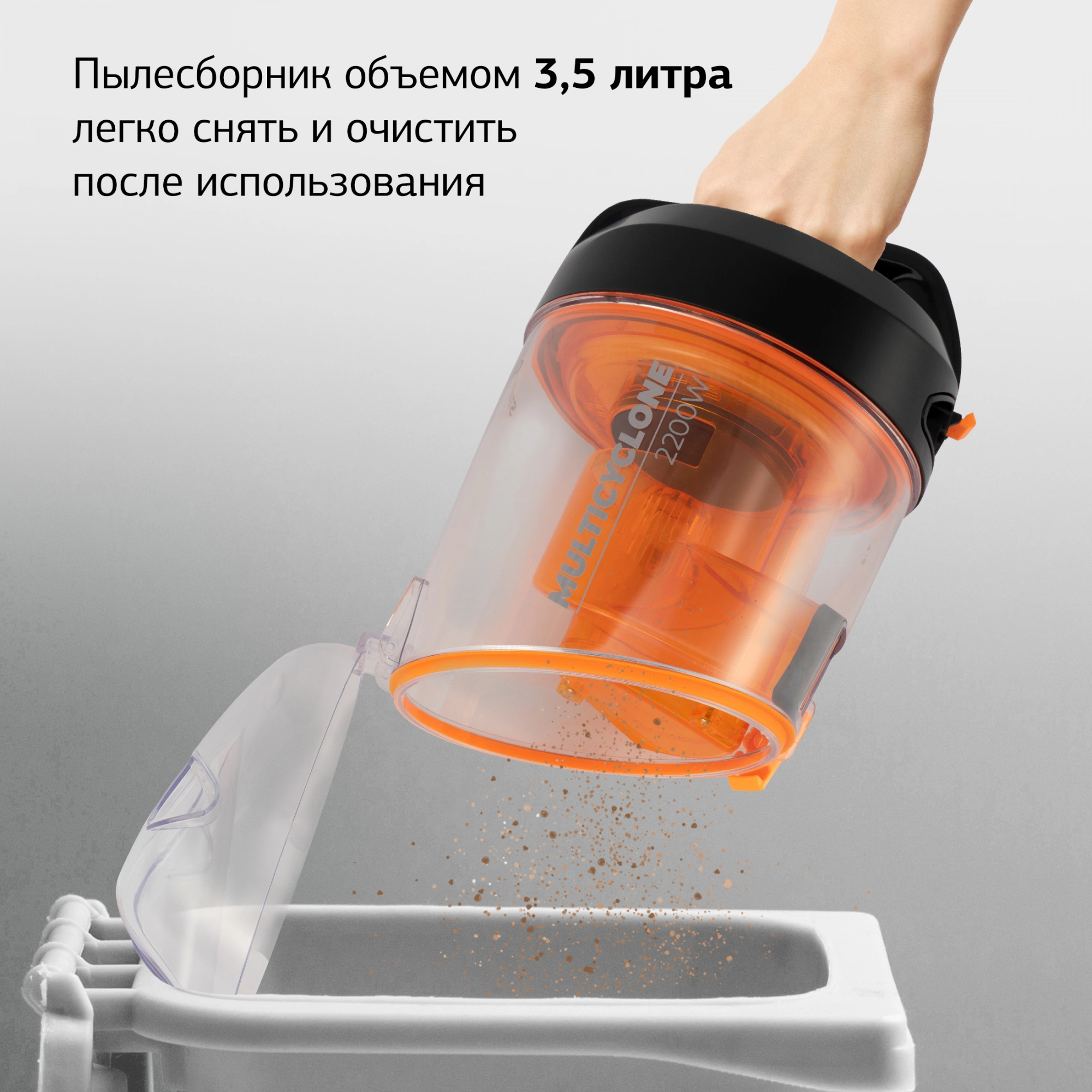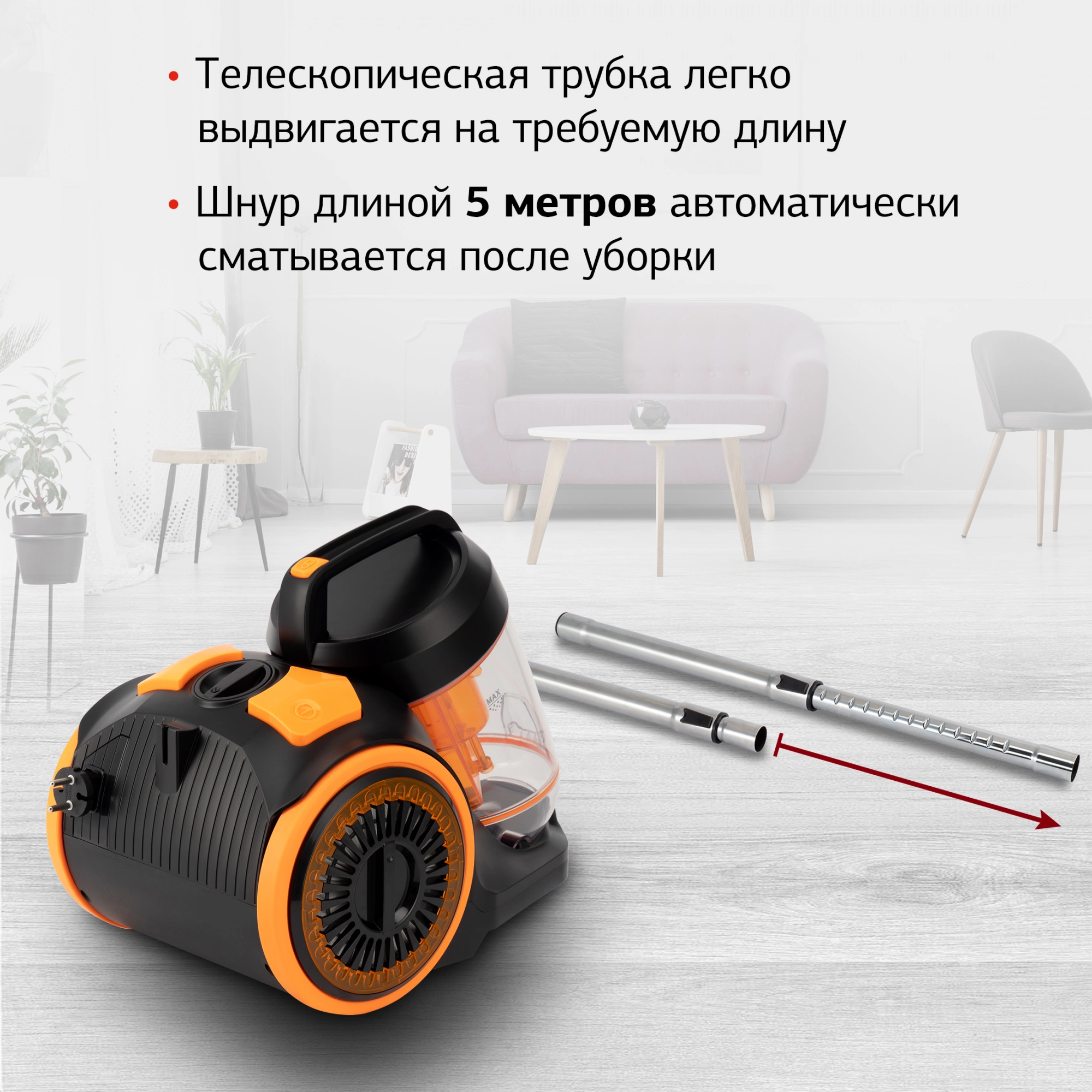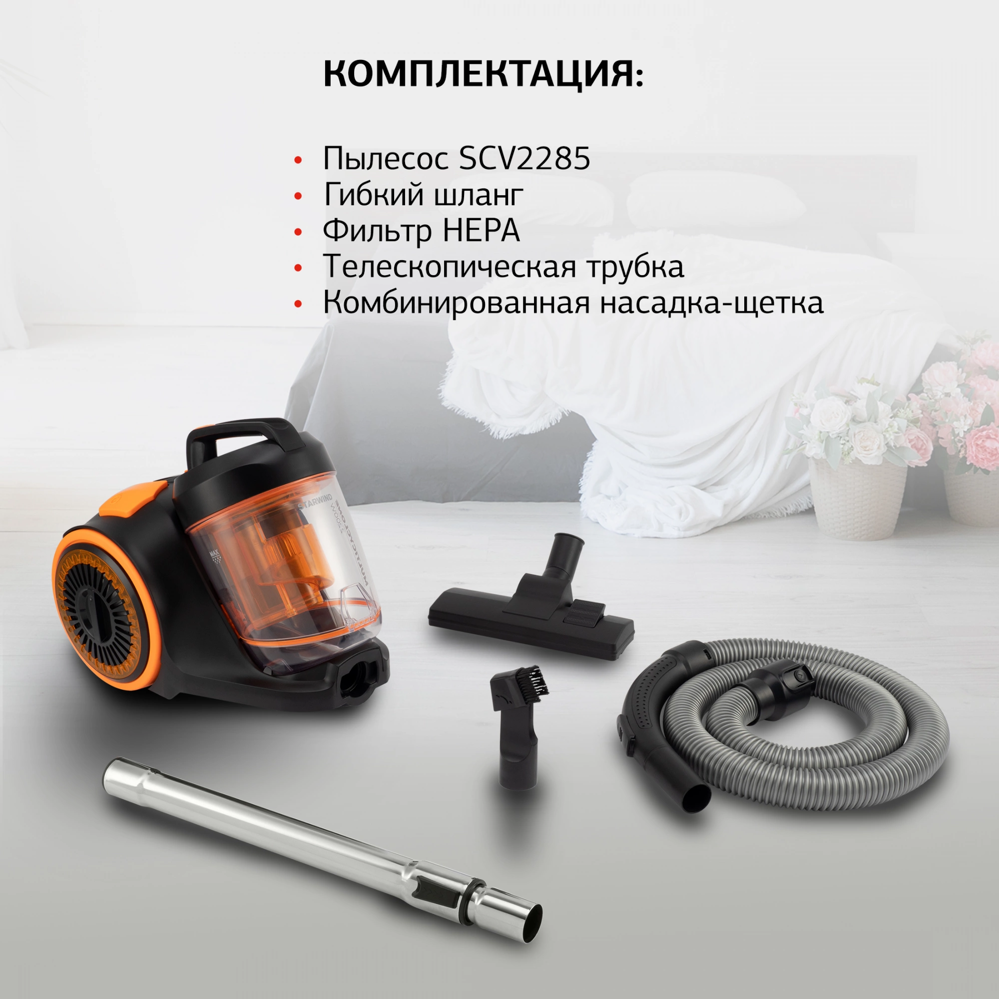 Пылесос Starwind SCV2285 2200W отличается компактностью и маневренностью. Благодаря прорезиненным колесикам увеличенного размера отлично преодолевает препятствия. Подходит для любого типа покрытий. В комплект входят насадка для уборки пола и ковров, а также щелевая насадка, которая имеет компактную щеточку для уборки мебели и труднодоступных мест. Мощности всасывания в 350 Вт вполне хватает, чтобы справиться с пылью, песком, шерстью животных, а также экономит электроэнергию. Пылесборник имеет объем 3,5 л, выполнен из прозрачного пластика. Это позволяет следить за степенью наполнения. Система циклон гарантирует надежную фильтрацию воздуха на выходе. Есть стакан для сбора мусора, фильтр тонкой очистки и моторный фильтр. Длина шнура более чем достаточная, составляет 5 метров. Он сматывается автоматически, с помощью кнопки на корпусе.