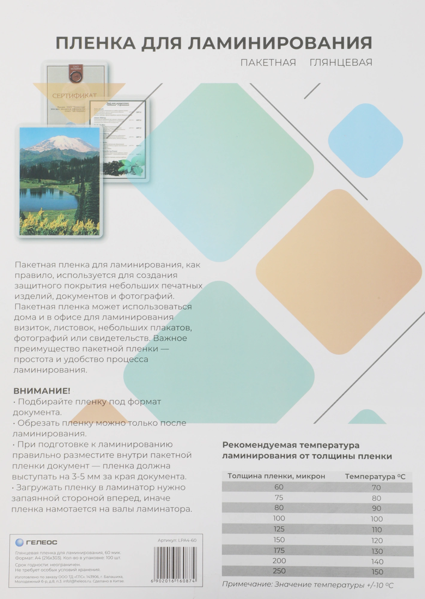 Пленка для ламинирования Heleos 60мкм A4 (100шт) глянцевая 216x303мм LPA4-60