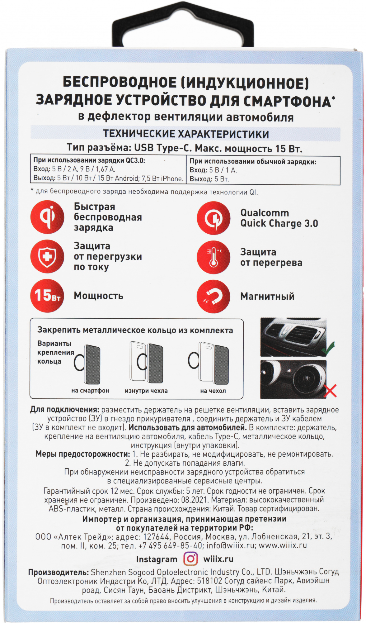Беспроводное (индукционное) зарядное устройство для смартфона, в дефлектор вентиляции автомобиля.В комплекте: держатель с функцией беспроводной зарядки (БЗУ), металлическое кольцо, крепление в дефлектор вентиляции автомобиля, кабель Type-C, инструкция. Максимальная мощность: 15 Вт.
