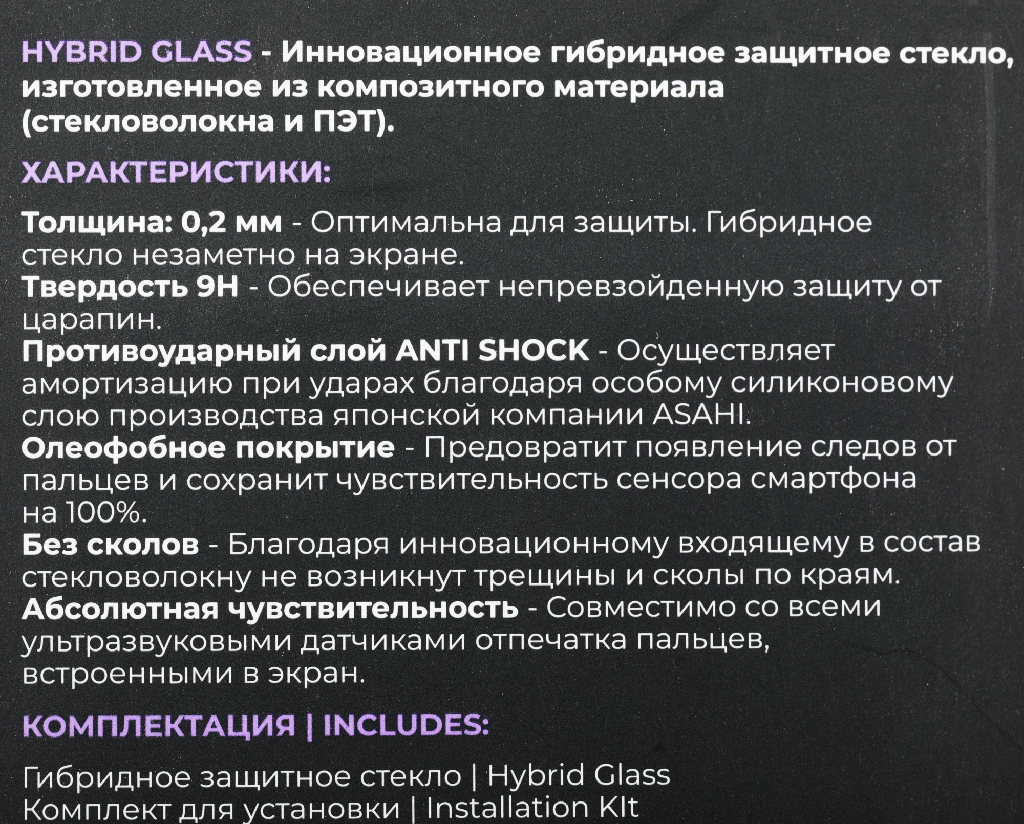 Толщина 0,2 мм, твёрдость 9H, противоударный слой, олеофобное покрытие, не скалывается по краям.