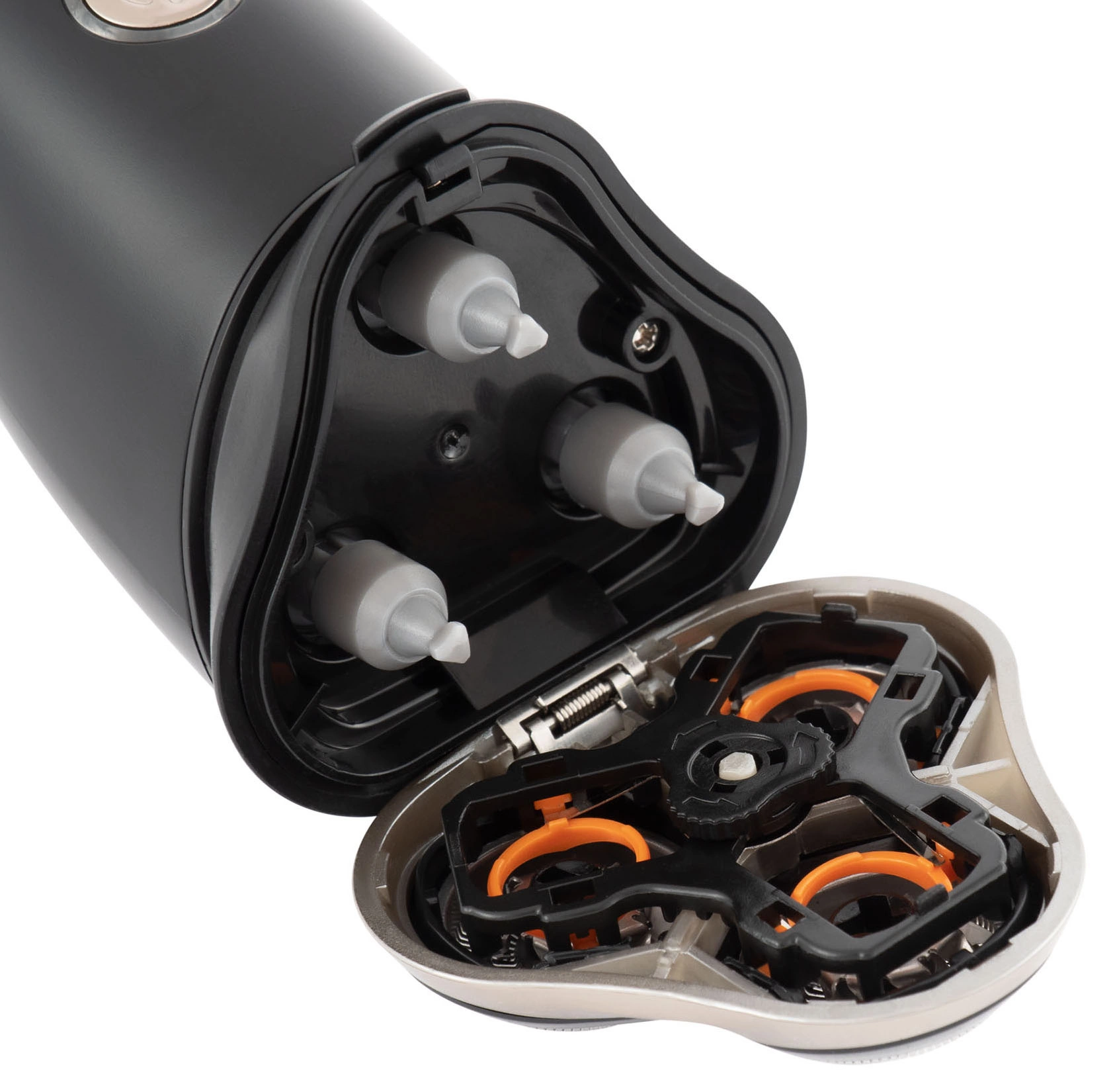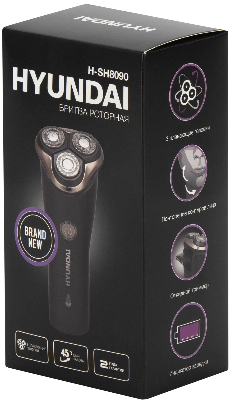 Практичная и компактная роторная бритва Hyundai H-SH8090 со встроенным аккумулятором точно понравится любому мужчине. Благодаря ей можно бриться сухим или влажным способом, а также не использовать косметические средства, что очень подходит мужчинам с чувствительной кожей. Три головки с плавающим механизмом подстраиваются под контуры вашего лица и удаляют даже самые маленькие волоски, а эргономичная форма бритвы удобна для руки. Благодаря водонепроницаемому корпусу вы можете промывать лезвие под водой, а на ярком дисплее будут отображаться индикаторы оставшегося уровня заряда и дорожная блокировка. Встроенный триммер поможет аккуратно и без раздражения подровнять бороду или усы. Установлен аккумулятор мощностью 3 Вт, которого хватит на 45 минут непрерывной работы, а на подзарядку уйдёт 8 часов. Управление осуществляется при помощи всего лишь одной кнопки. Щёточка для чистки, сетевой адаптер, защитный колпачок и подставка для зарядки прилагаются в комплекте.