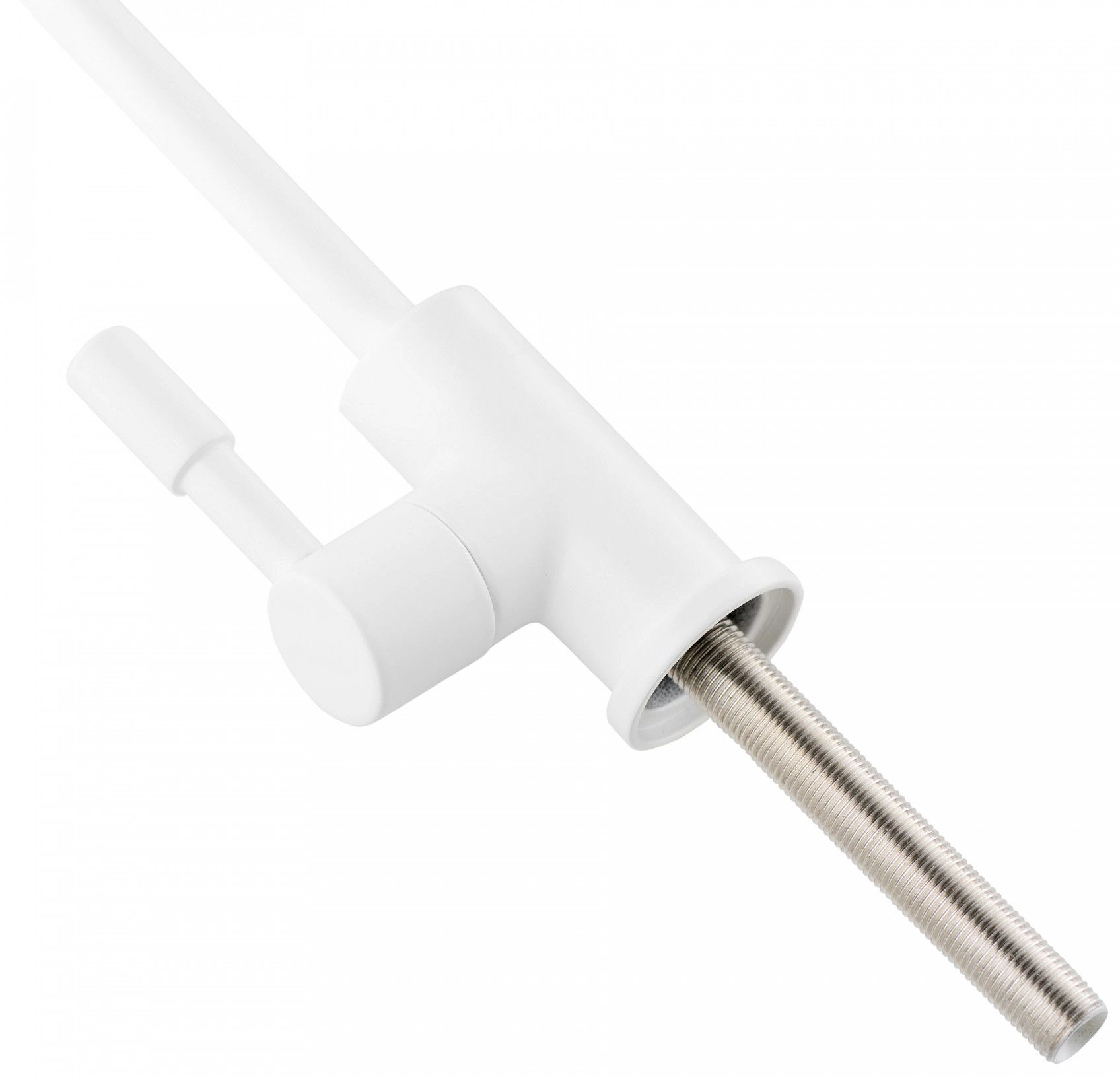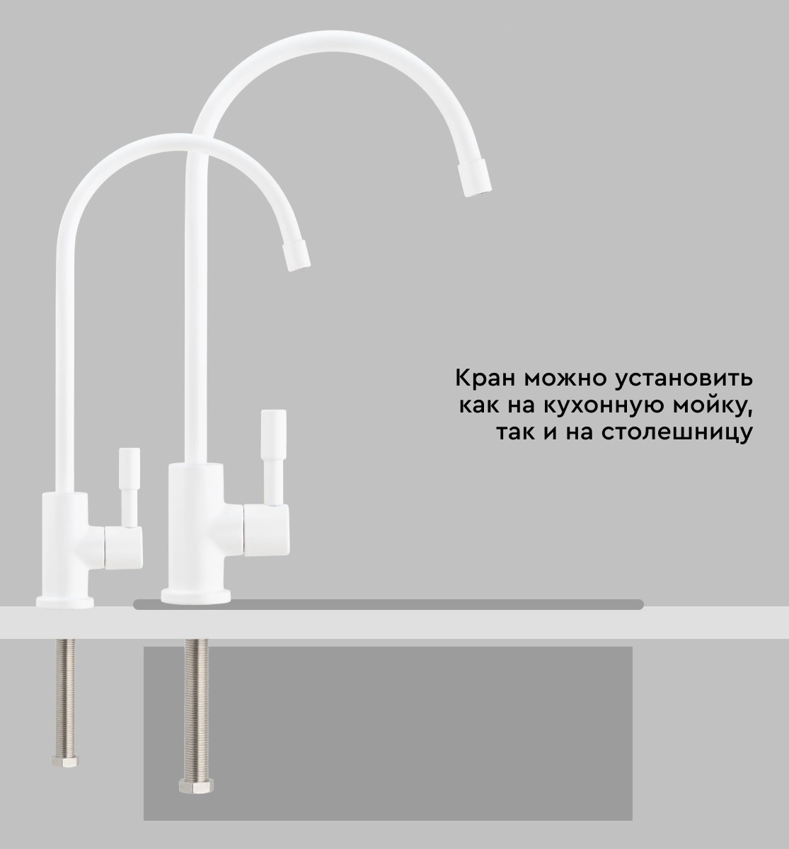 Кран для питьевой воды выполнен в белом матовом цвете - подойдет ценителям стиля и тем, кто хочет выдержать свою кухню в единой цветовой гамме. Предназначен для подачи очищенной воды из системы фильтрации (проточной или обратноосмотической).