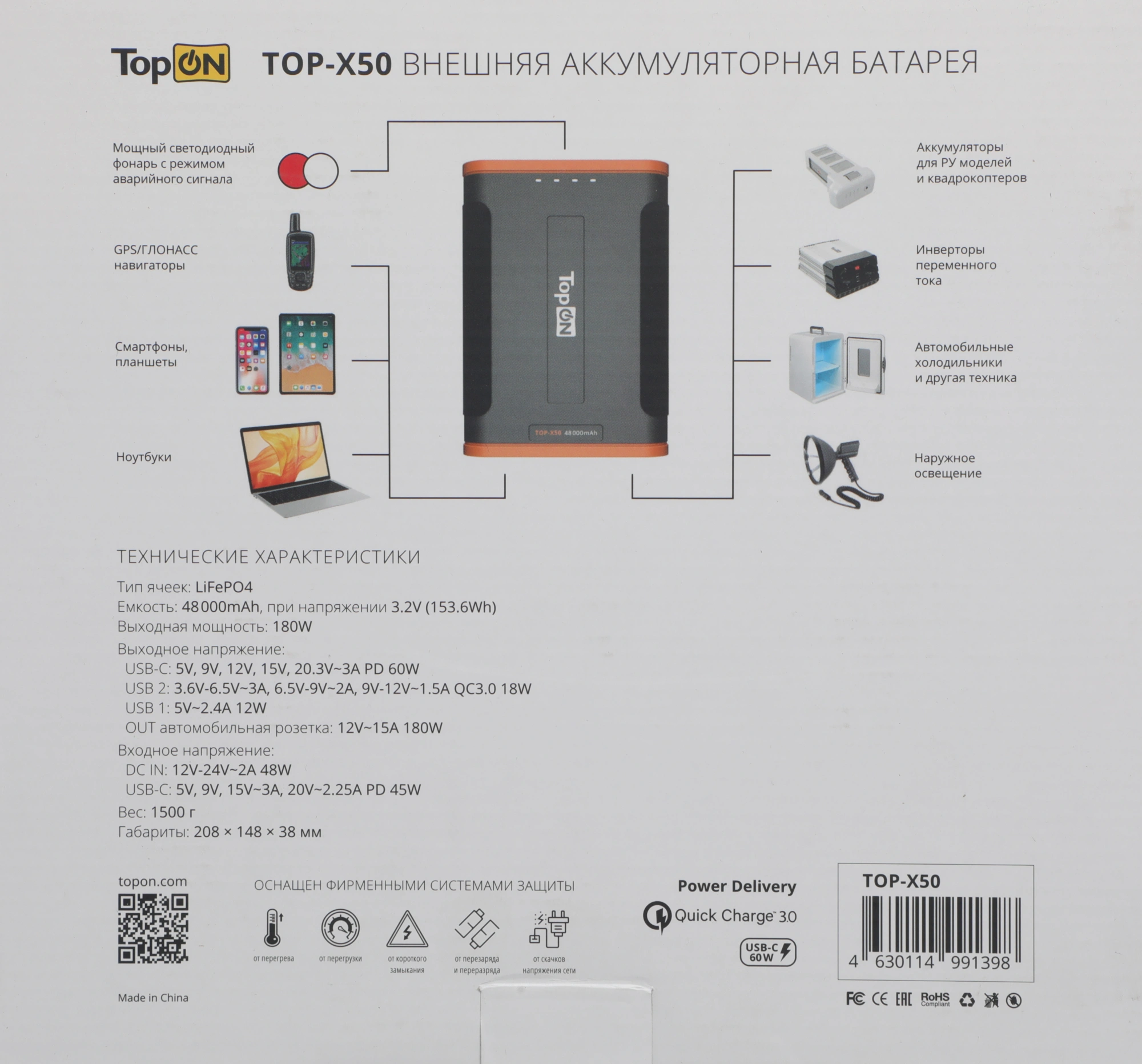 Внешний аккумулятор TopON 48000mAh Type-C PD 60W, USB1 QC3.0, USB2 12W, авторозетка 180W, фонарь, защита от брызг.Работает при отрицательных температурах.Возможность заряжать несколько устройств одновременно.Незаменим для кемпинга, походов, путешествий, охоты, рыбалки.