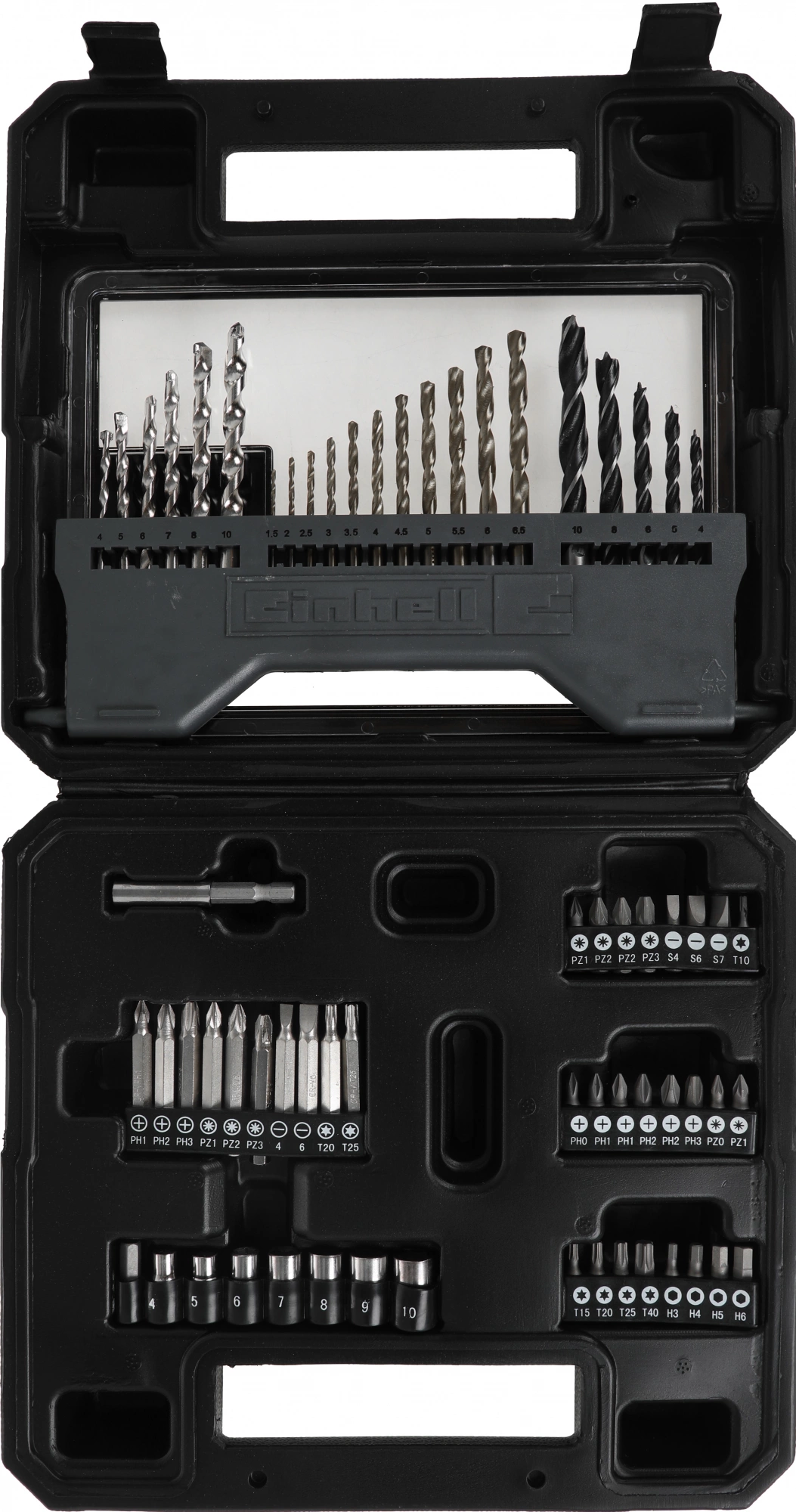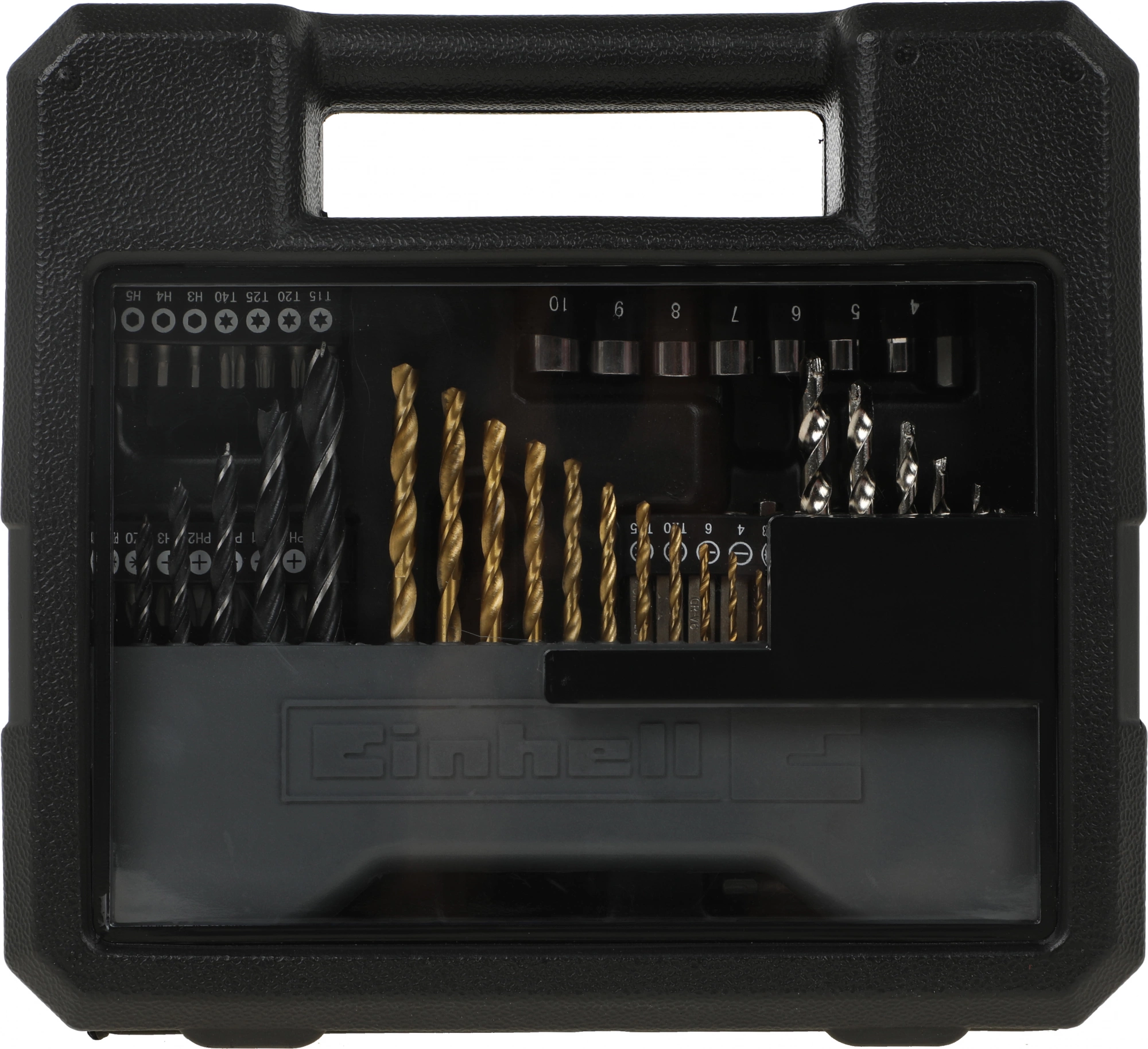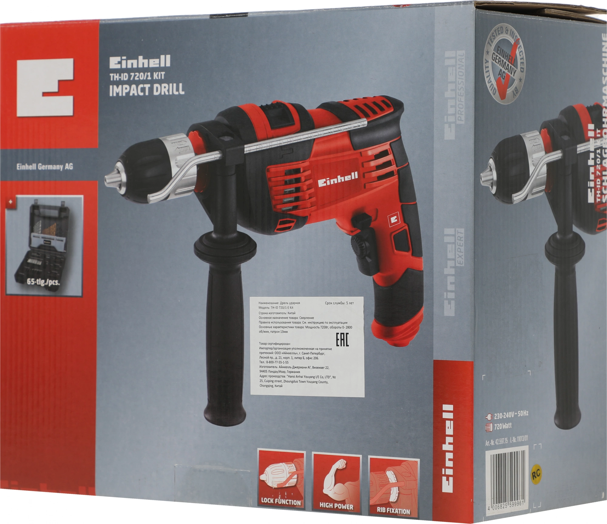 Дрель, набор оснастки, дополнительная рукоятка, ограничитель глубины сверления, коробка.
