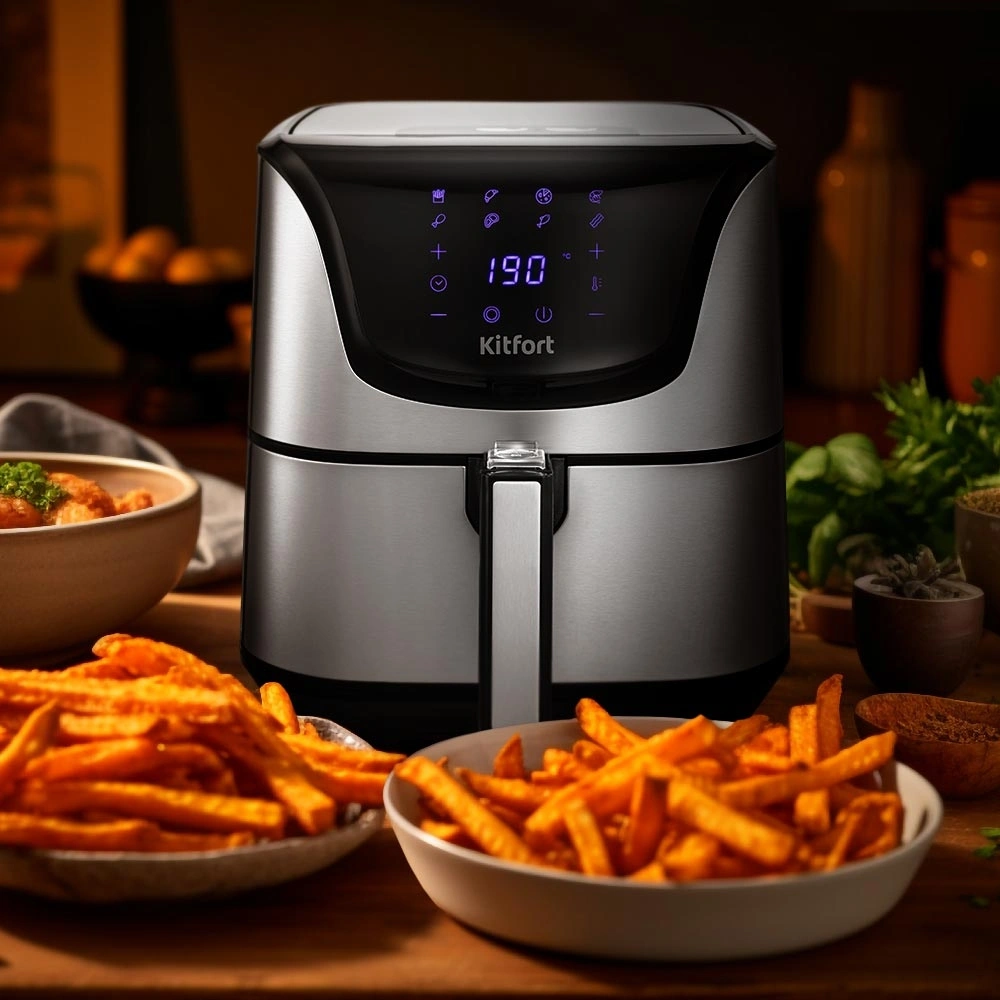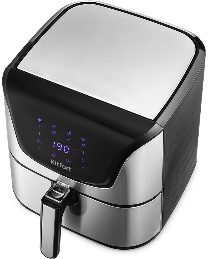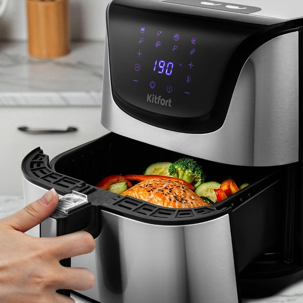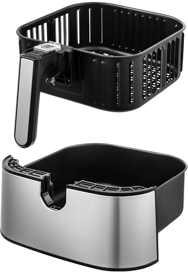 Стильный аэрогриль может использоваться как аэрогриль, а также как аэрофритюрница и духовка и позволяет готовить большинство продуктов с минимальным количеством масла или вовсе без его добавления.