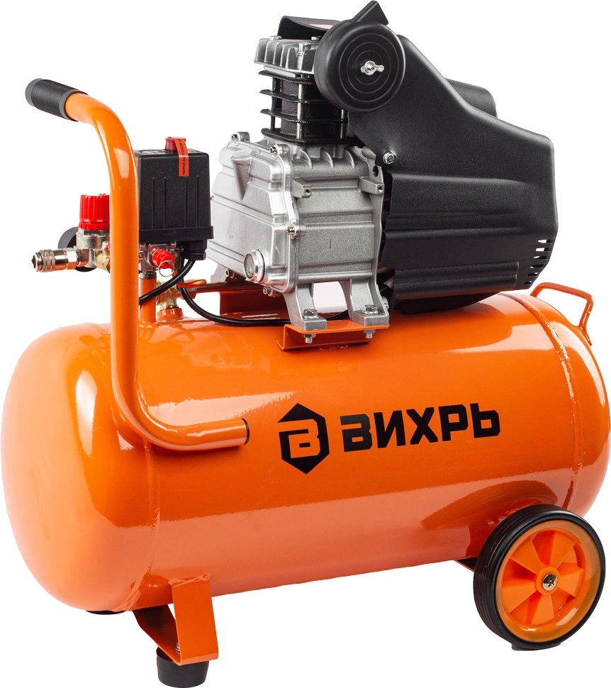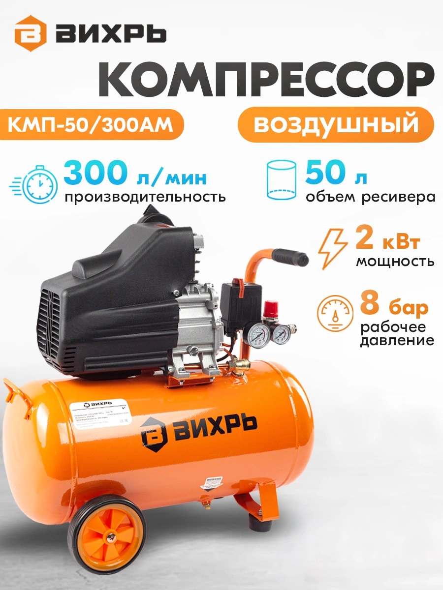 Компрессор Вихрь КМП-50/300АМ 74/3/12 используется для нагнетания сжатого воздуха в различное пневмооборудование в ходе строительно-ремонтных работ в квартире или на даче.