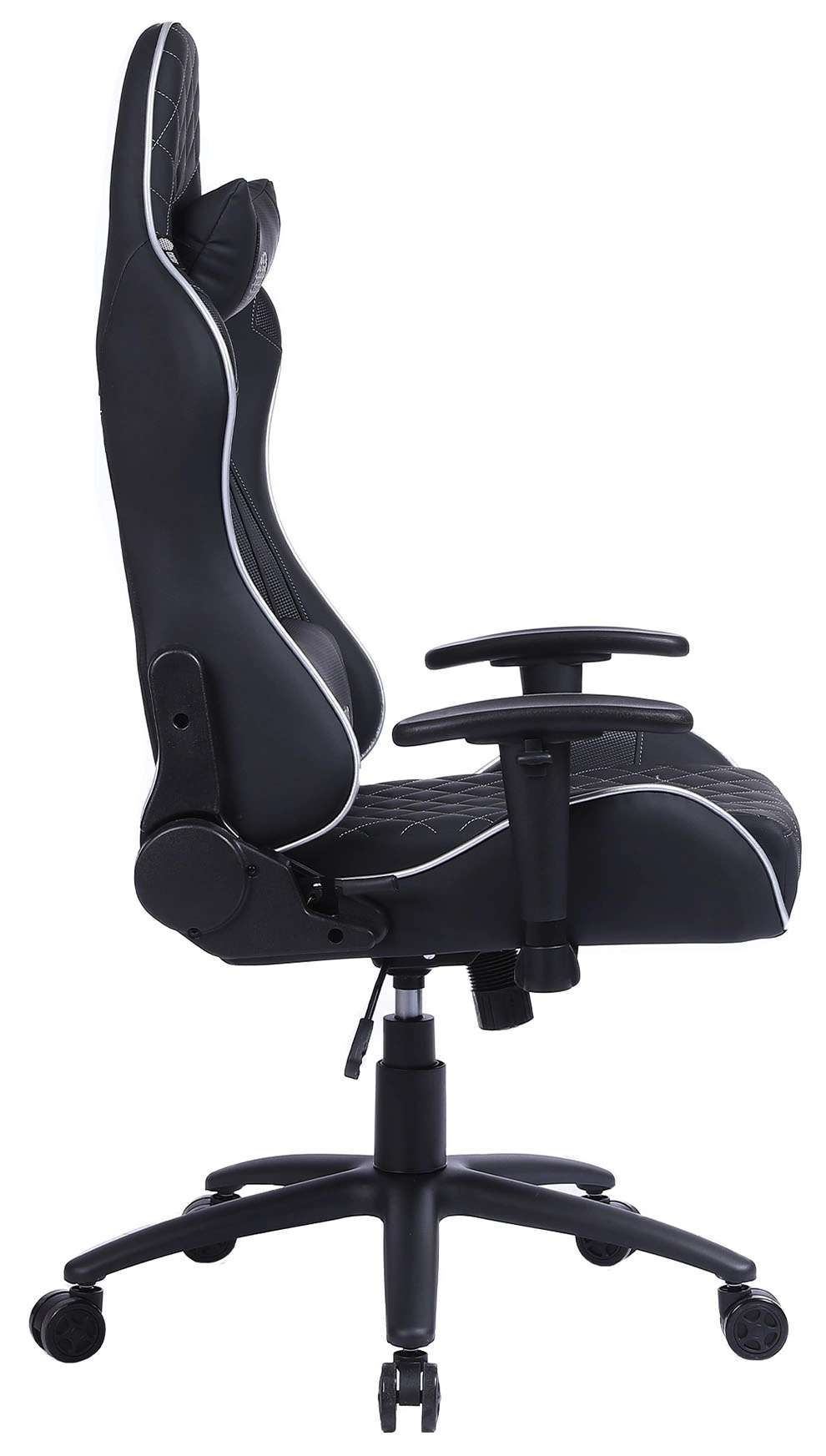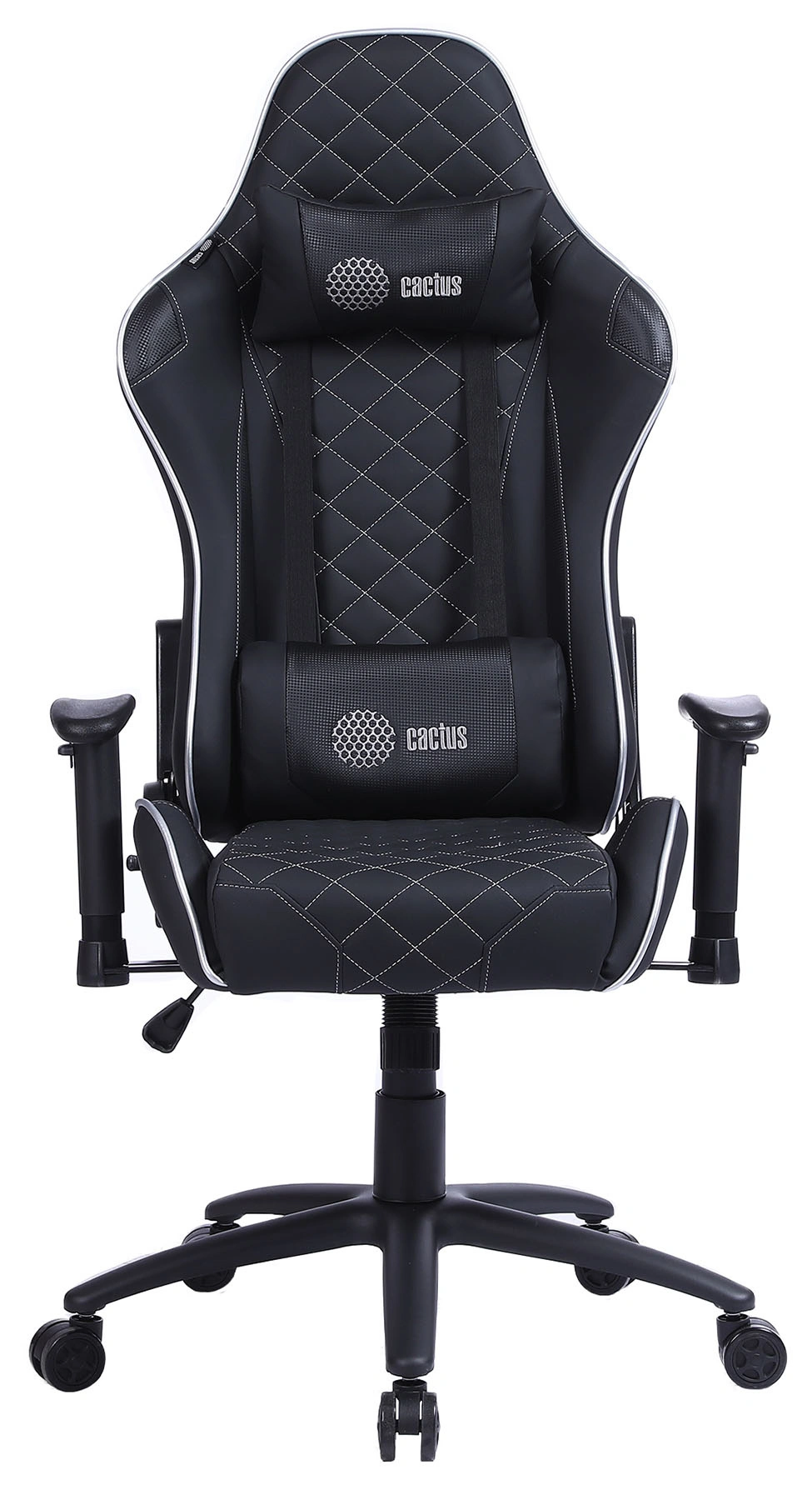Классическое игровое кресло выполнено в строгих тонах с элементами прошивки подголовья и спинки и украшен контрастной белой строчкой.