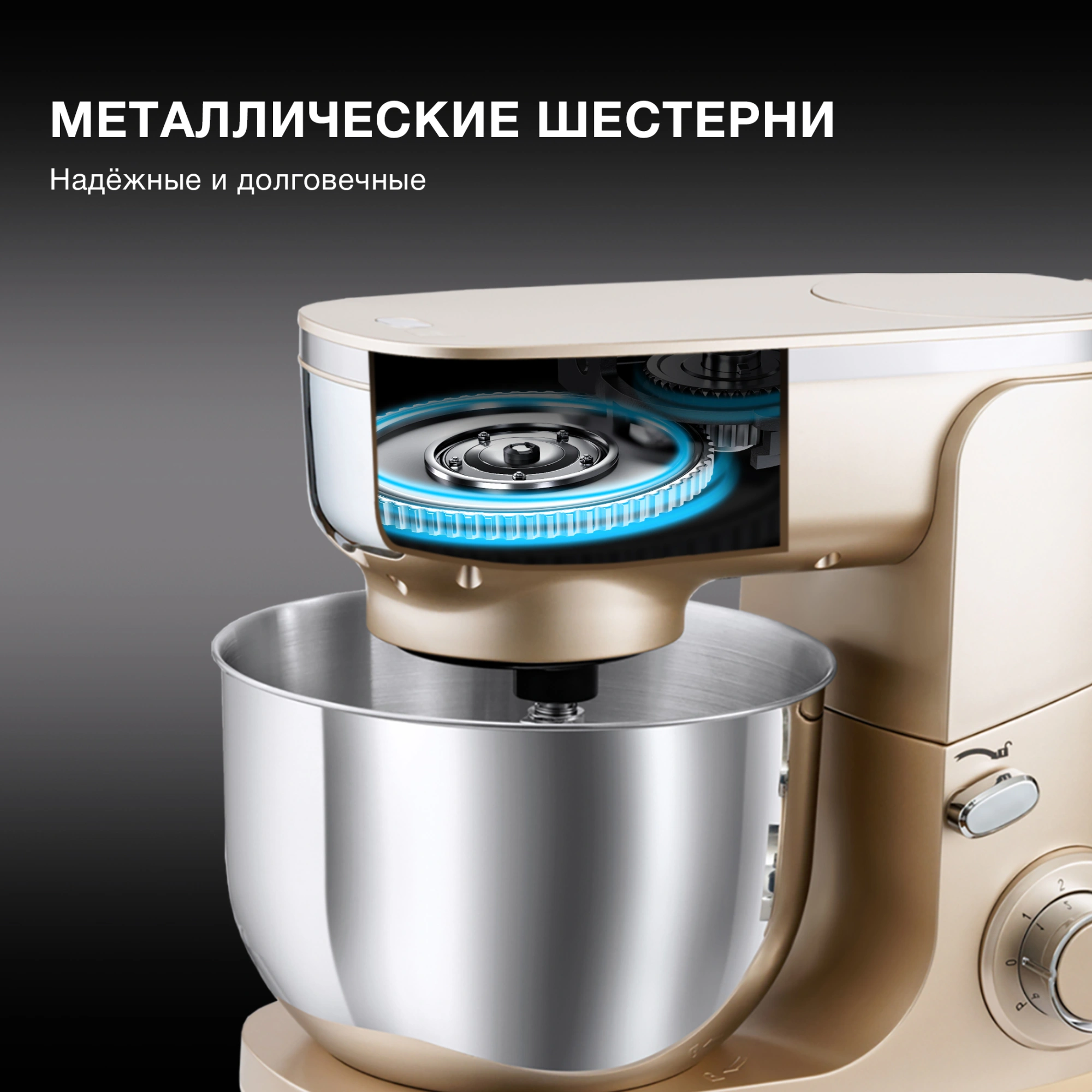Устройство объединяет в одном удобном корпусе функционал мясорубки, блендера и перемешивателя теста. Раньше для каждой из этих задач нужен был собственный прибор, но теперь достаточно одного. Все насадки снимаются и надеваются в необходимой комбинации, так что хранить Hyundai HYMS7451 постоянно в собранном виде необходимости нет. Можно задействовать непосредственно то, что нужно в данный момент. Объём чаши для теста составляет 5 л. Его достаточно для приготовления основы даже для большого пирога или нескольких средних пицц. Также данная модель поддерживает планетарное вращение, когда вокруг своей оси ходит не только активная часть, но и тара. Так её содержимое принимает более равномерную консистенцию.