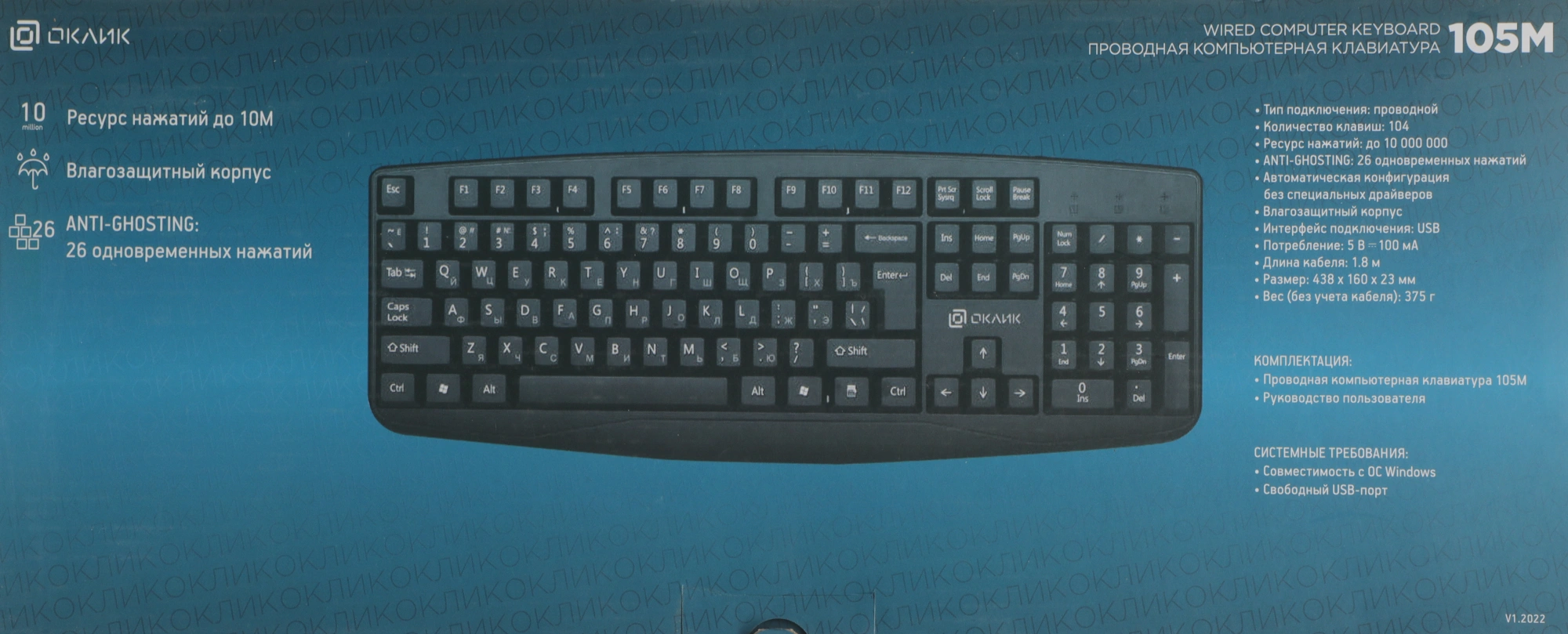 Клавиатура выполнена в полноразмерном формате и оборудована 104 клавишами с солидным ресурсом кликов – до 10 млн. 26 клавиш поддерживают технологию Anti-Ghosting, которая исключает фантомные нажатия. Модель Oklick 105M поможет с комфортом выполнять все виды домашних и офисных задач, будь то работа с табличными данными и цифрами или быстрый ввод больших объемов текста.